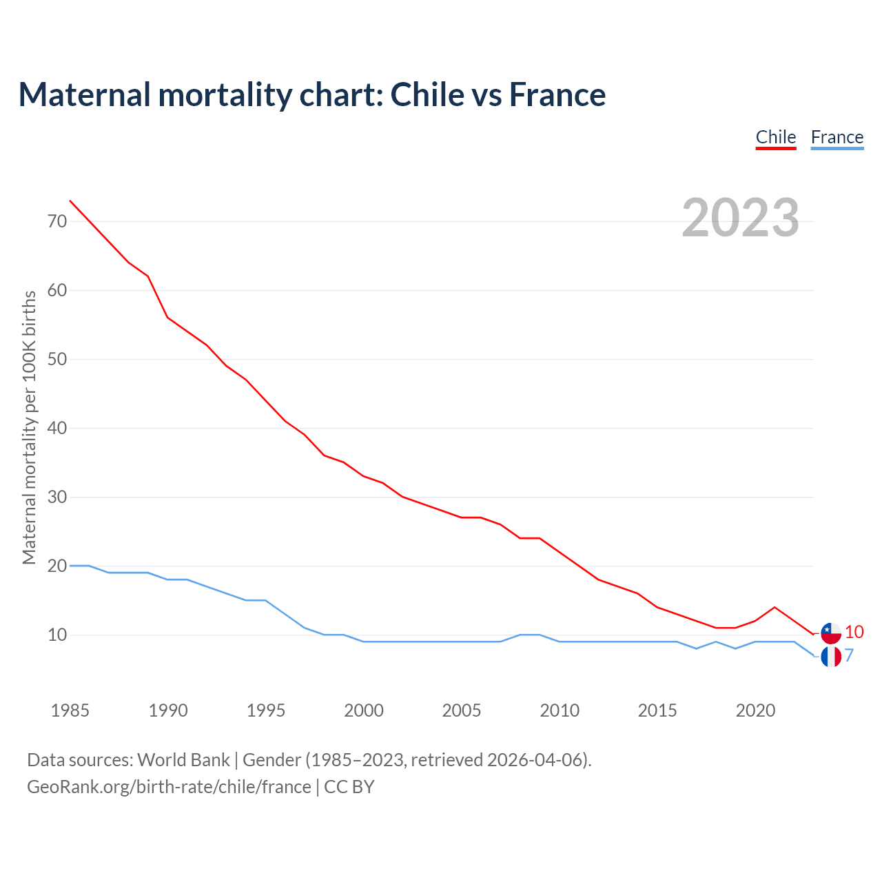 The maternal mortality rate, which is the probability of dying during childbirth or within 42 days of pregnancy termination, is 10 deaths per 100,000 live births in Chile, compared to 7 deaths in France.
