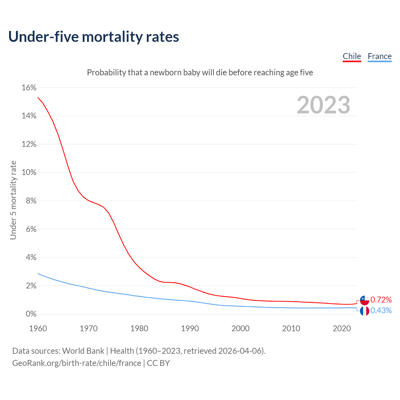 The chance that a newborn baby will die before reaching age five is 0.72% in Chile and 0.43% in France. Above is a chart with historical data on under-five mortality rates.