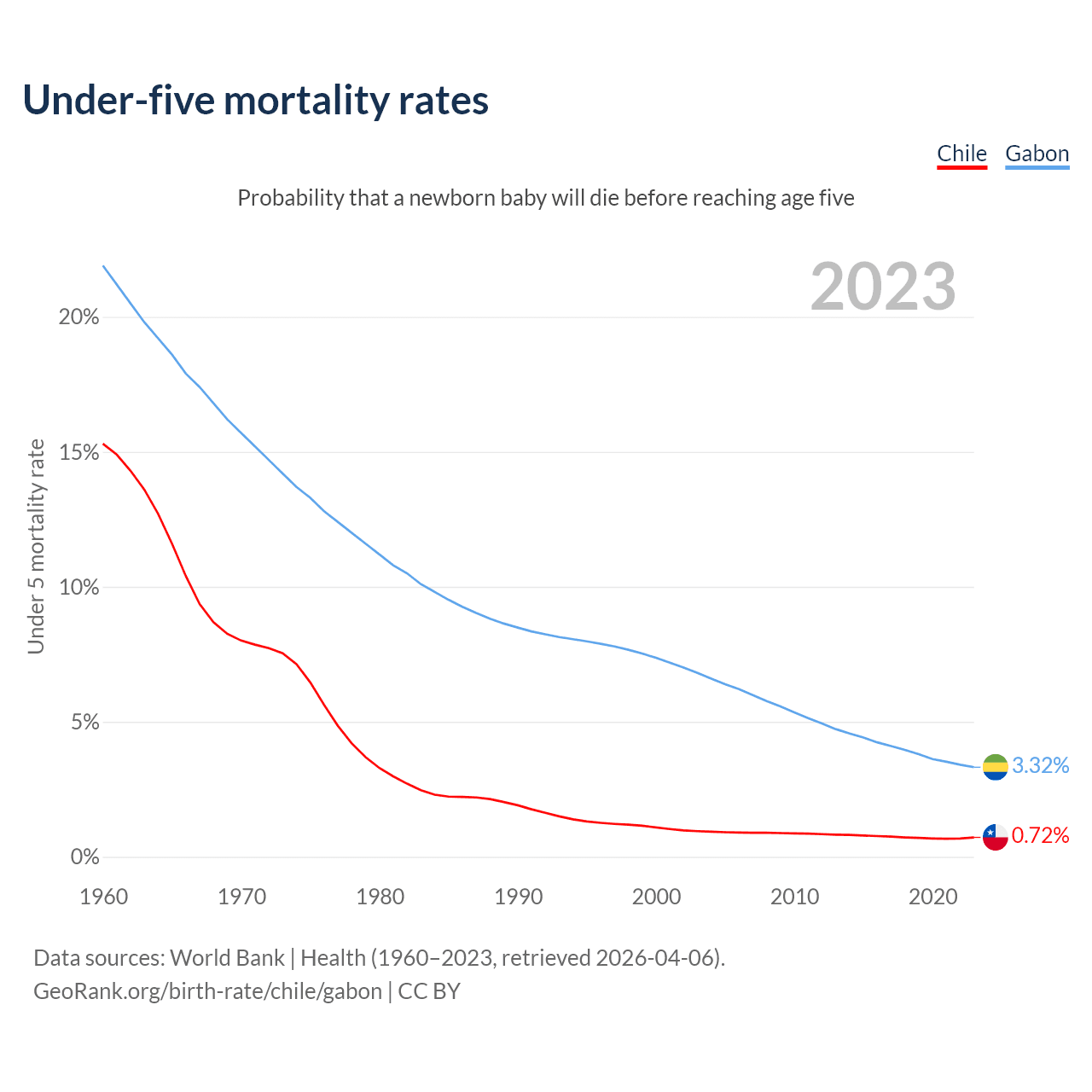The chance that a newborn baby will die before reaching age five is 0.72% in Chile and 3.32% in Gabon. Above is a chart with historical data on under-five mortality rates.