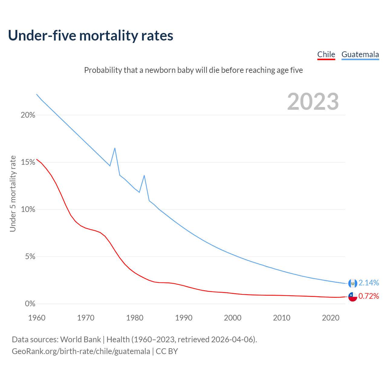 The chance that a newborn baby will die before reaching age five is 0.72% in Chile and 2.14% in Guatemala. Above is a chart with historical data on under-five mortality rates.