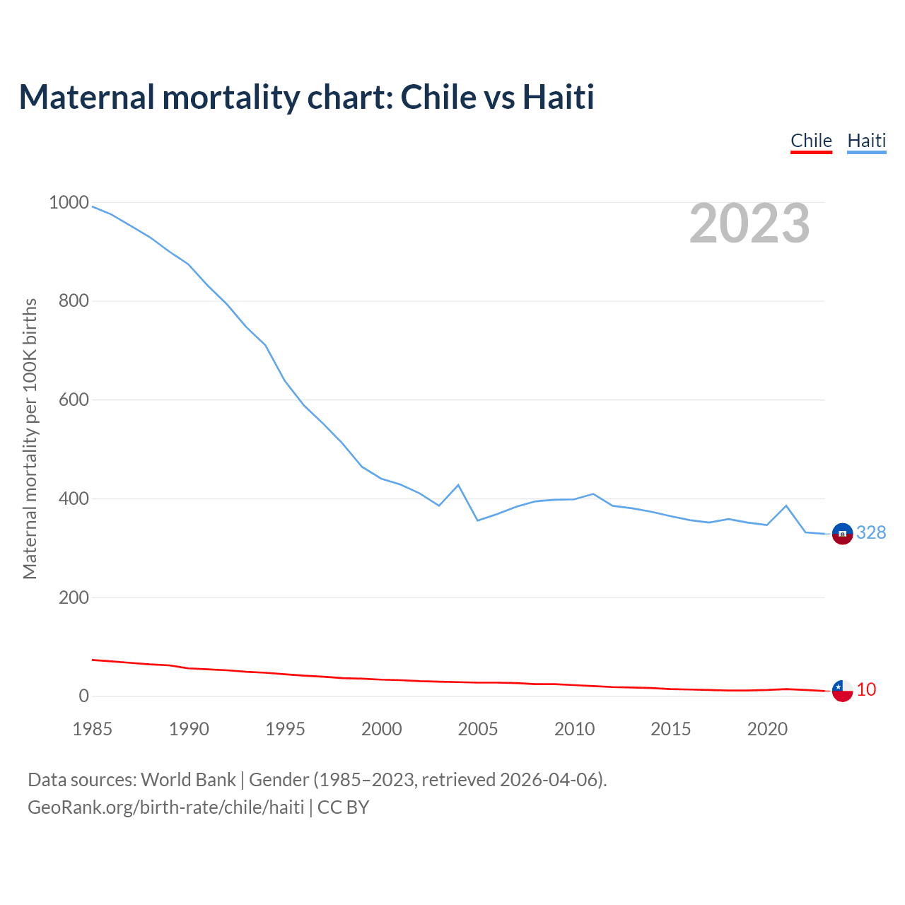 The maternal mortality rate, which is the probability of dying during childbirth or within 42 days of pregnancy termination, is 10 deaths per 100,000 live births in Chile, compared to 328 deaths in Haiti.