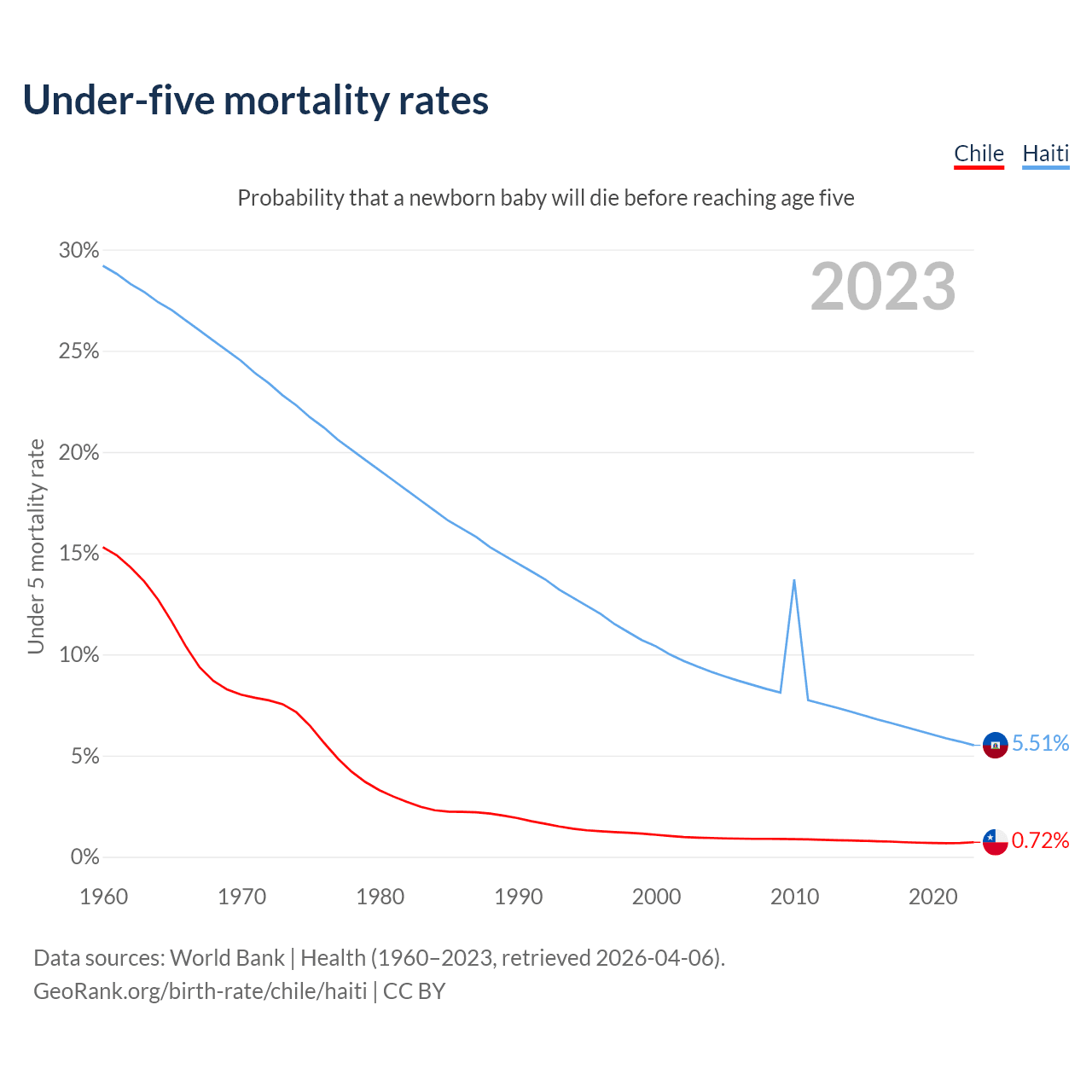 The chance that a newborn baby will die before reaching age five is 0.72% in Chile and 5.51% in Haiti. Above is a chart with historical data on under-five mortality rates.