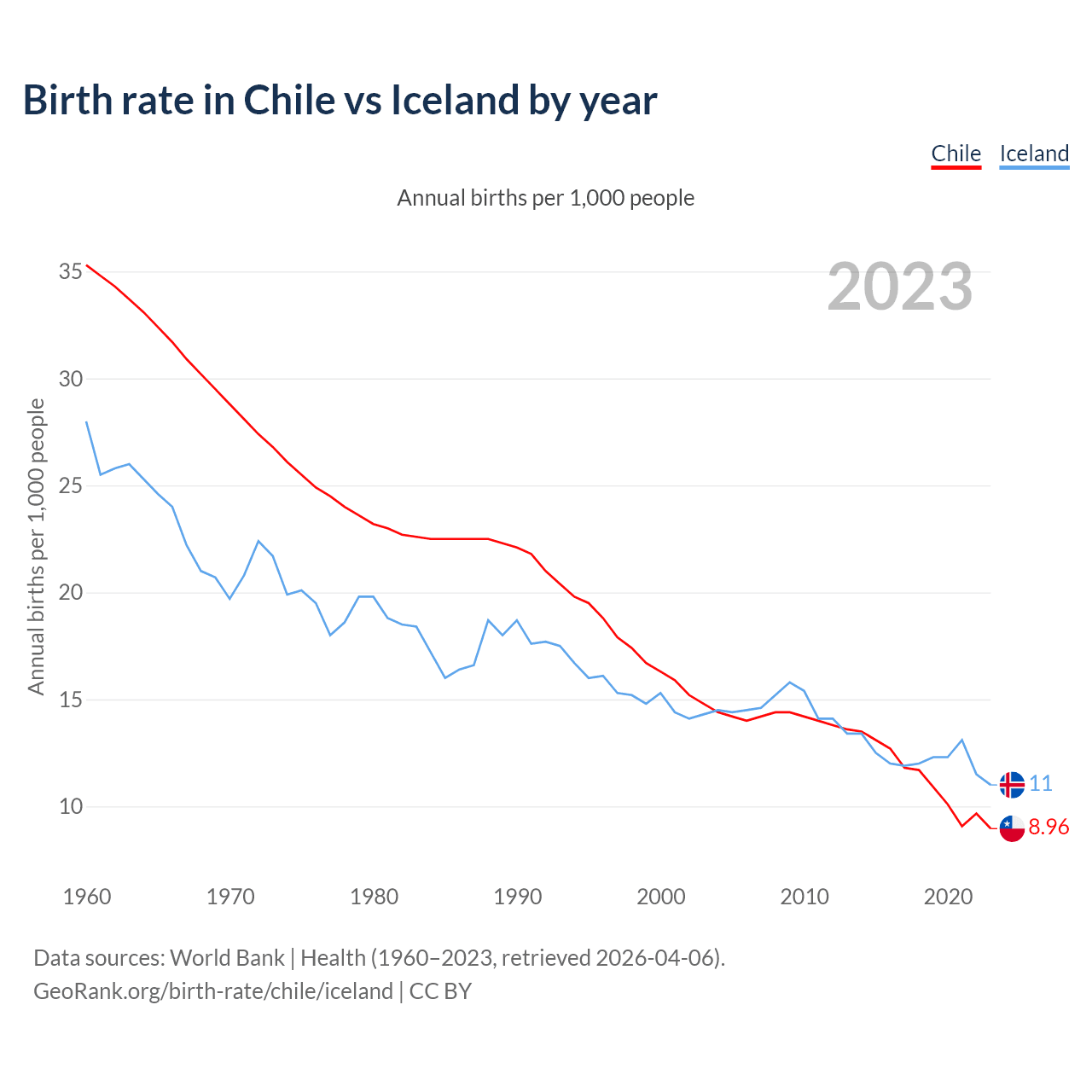 According to the latest available data on birth rates, the fertility rate in Chile was 1.17 children per woman in 2023, compared to 1.59 in Iceland in 2023. The replacement level is considered to be 2.1 children per woman.