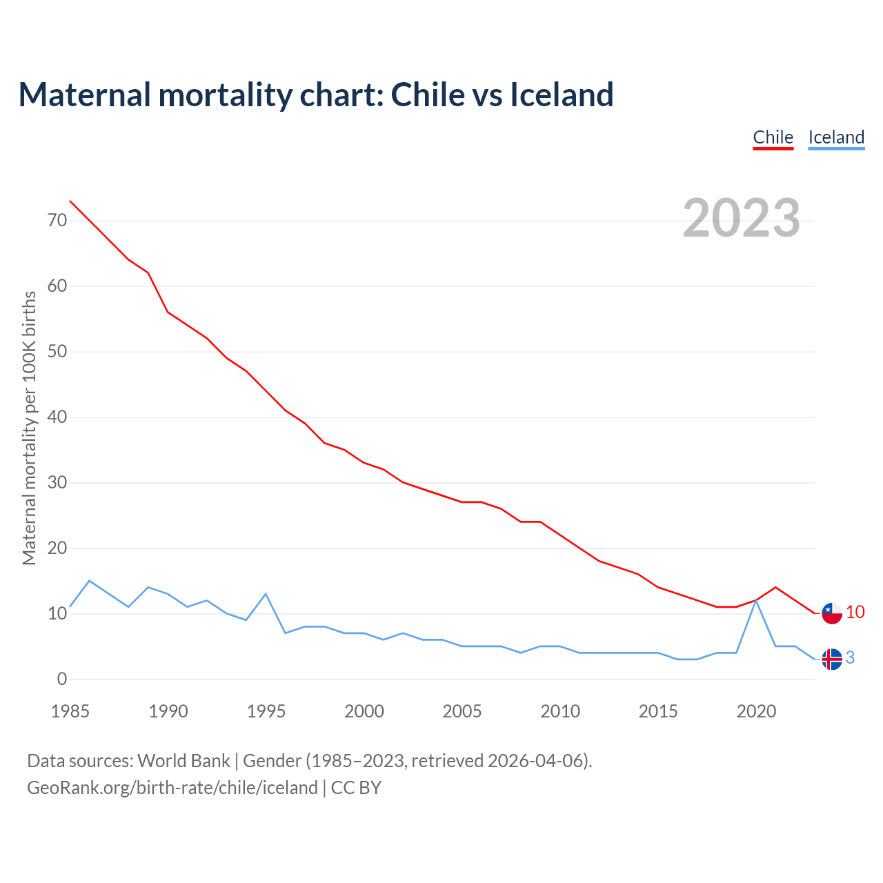 The maternal mortality rate, which is the probability of dying during childbirth or within 42 days of pregnancy termination, is 10 deaths per 100,000 live births in Chile, compared to 3 deaths in Iceland.