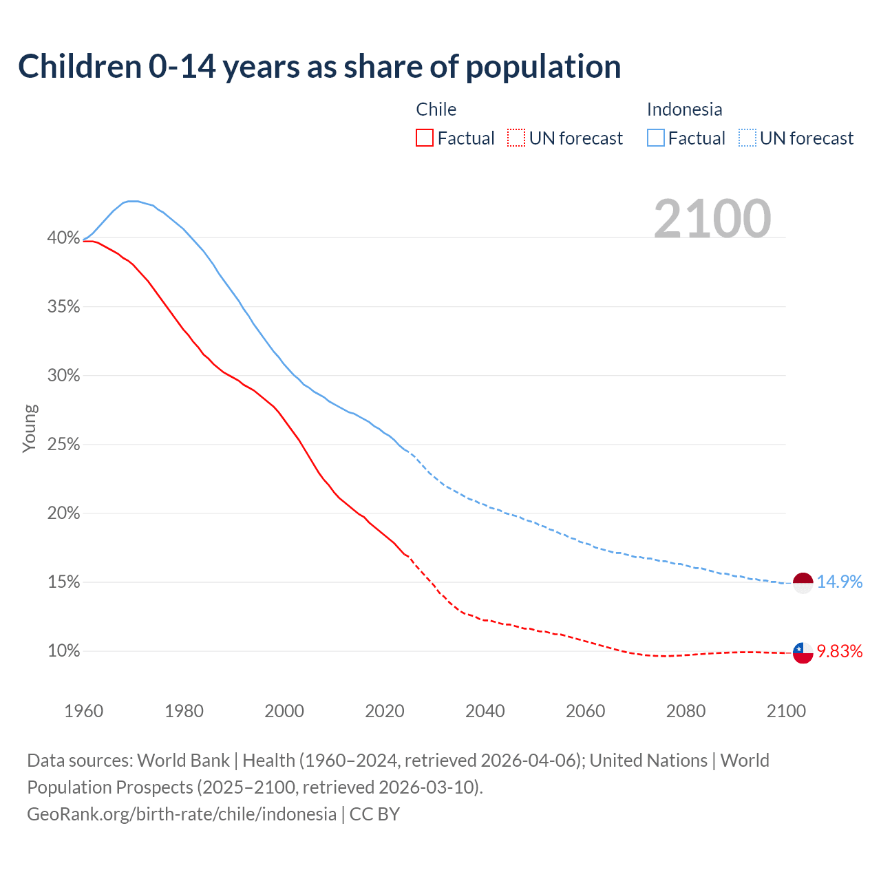 According to the latest available data on birth rates, the fertility rate in Chile was 1.17 children per woman in 2023, compared to 2.13 in Indonesia in 2023. The replacement level is considered to be 2.1 children per woman.