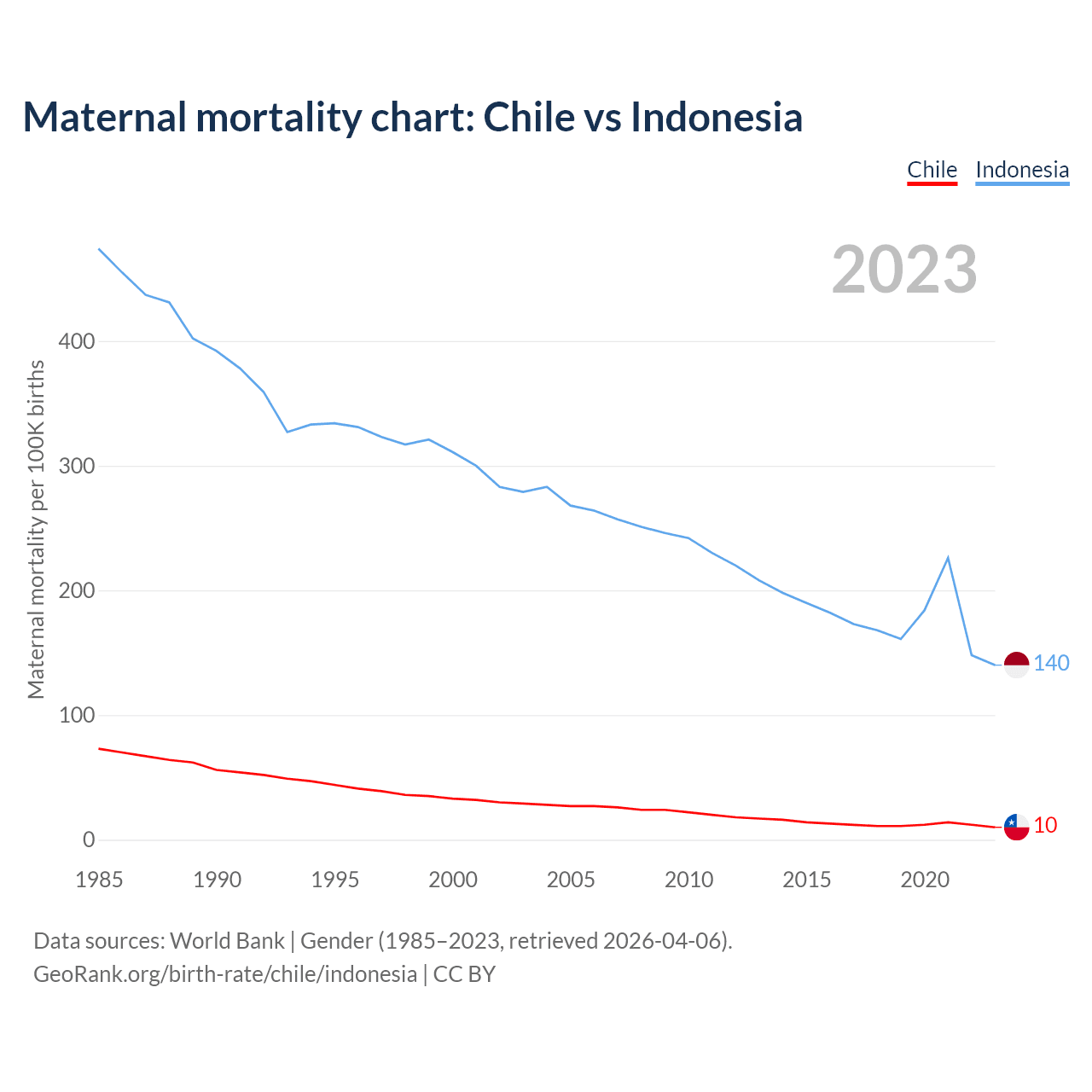 The maternal mortality rate, which is the probability of dying during childbirth or within 42 days of pregnancy termination, is 10 deaths per 100,000 live births in Chile, compared to 140 deaths in Indonesia.