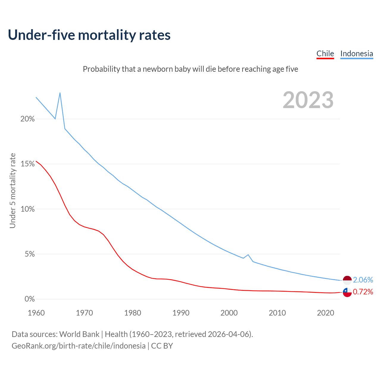 The chance that a newborn baby will die before reaching age five is 0.72% in Chile and 2.06% in Indonesia. Above is a chart with historical data on under-five mortality rates.