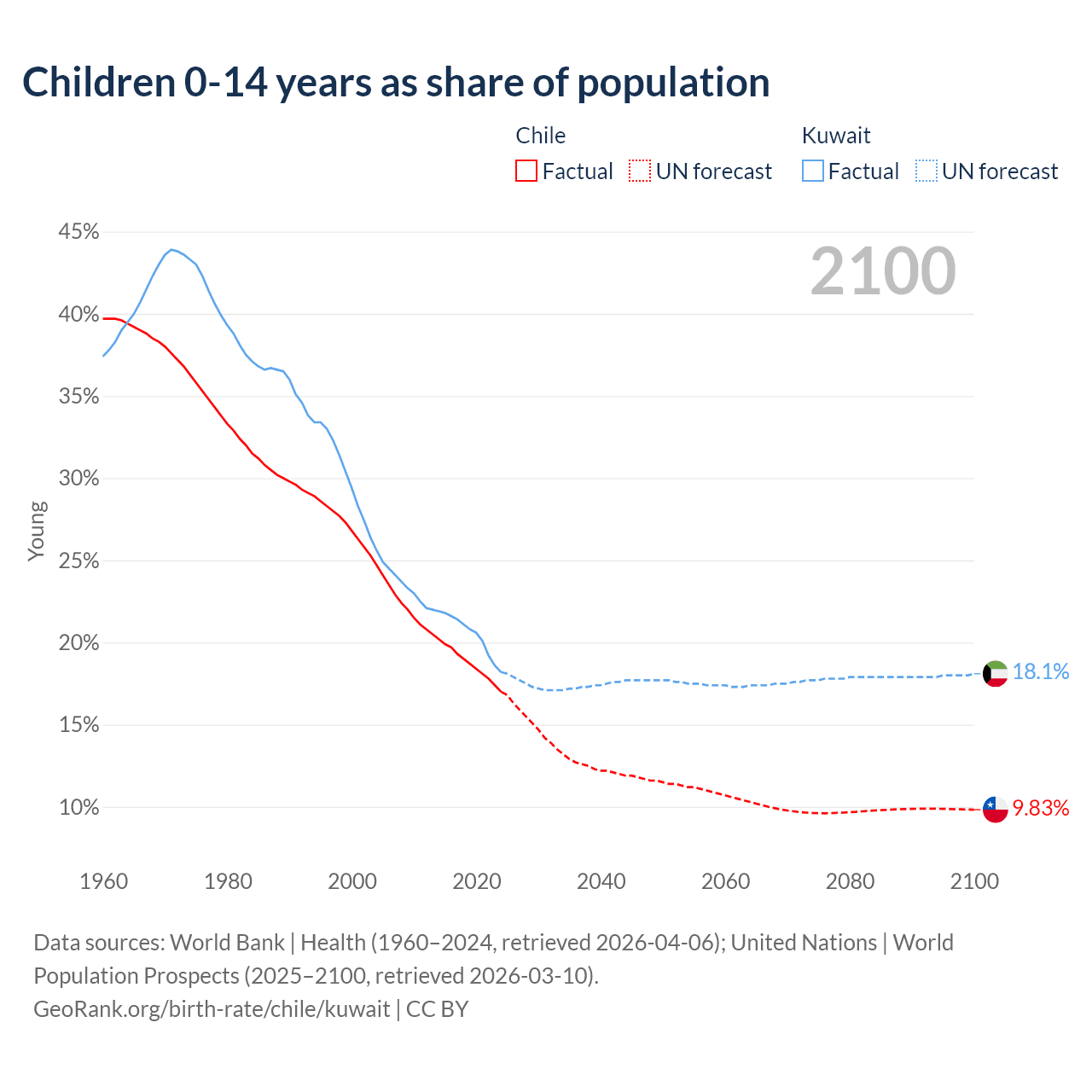 According to the latest available data on birth rates, the fertility rate in Chile was 1.17 children per woman in 2023, compared to 1.52 in Kuwait in 2023. The replacement level is considered to be 2.1 children per woman.