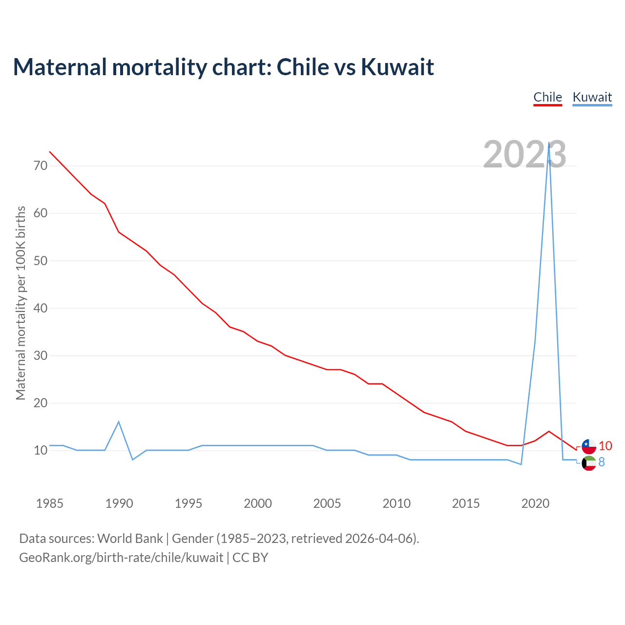 The maternal mortality rate, which is the probability of dying during childbirth or within 42 days of pregnancy termination, is 10 deaths per 100,000 live births in Chile, compared to 8 deaths in Kuwait.