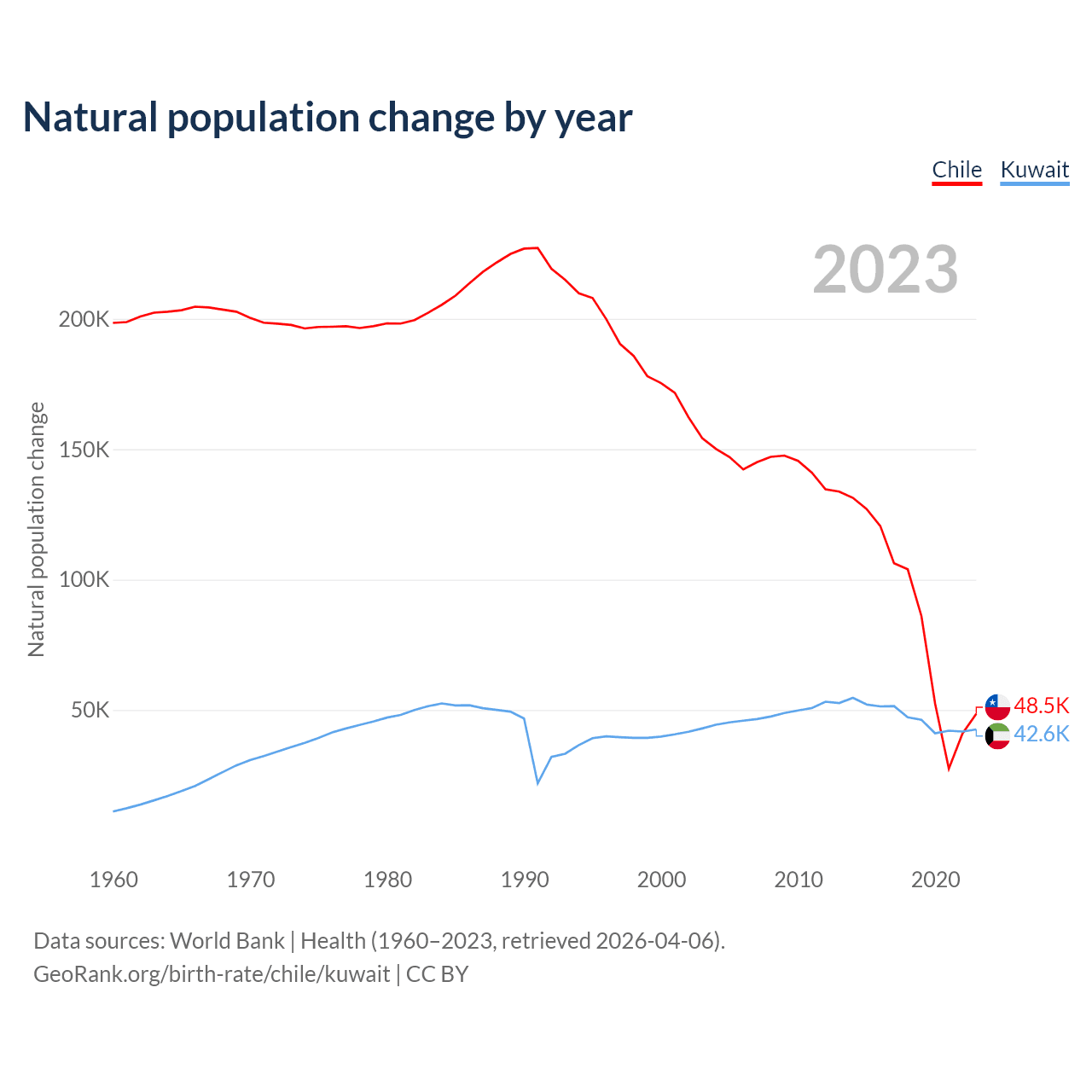 Chile has an annual birth rate of 8.96 births per 1,000 people, compared to 10.3 for Kuwait. The average number of children a woman is expected to have during her lifetime — the fertility rate, is 1.17 in Chile and 1.52 in Kuwait — 30.6% difference.