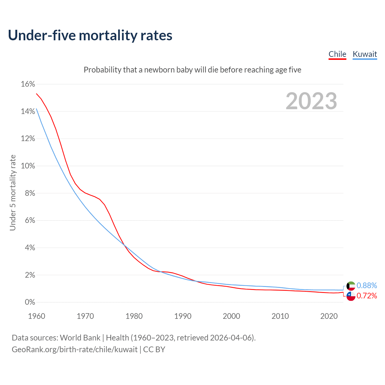 The chance that a newborn baby will die before reaching age five is 0.72% in Chile and 0.88% in Kuwait. Above is a chart with historical data on under-five mortality rates.