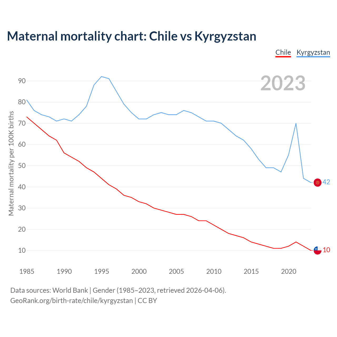 The maternal mortality rate, which is the probability of dying during childbirth or within 42 days of pregnancy termination, is 10 deaths per 100,000 live births in Chile, compared to 42 deaths in Kyrgyzstan.