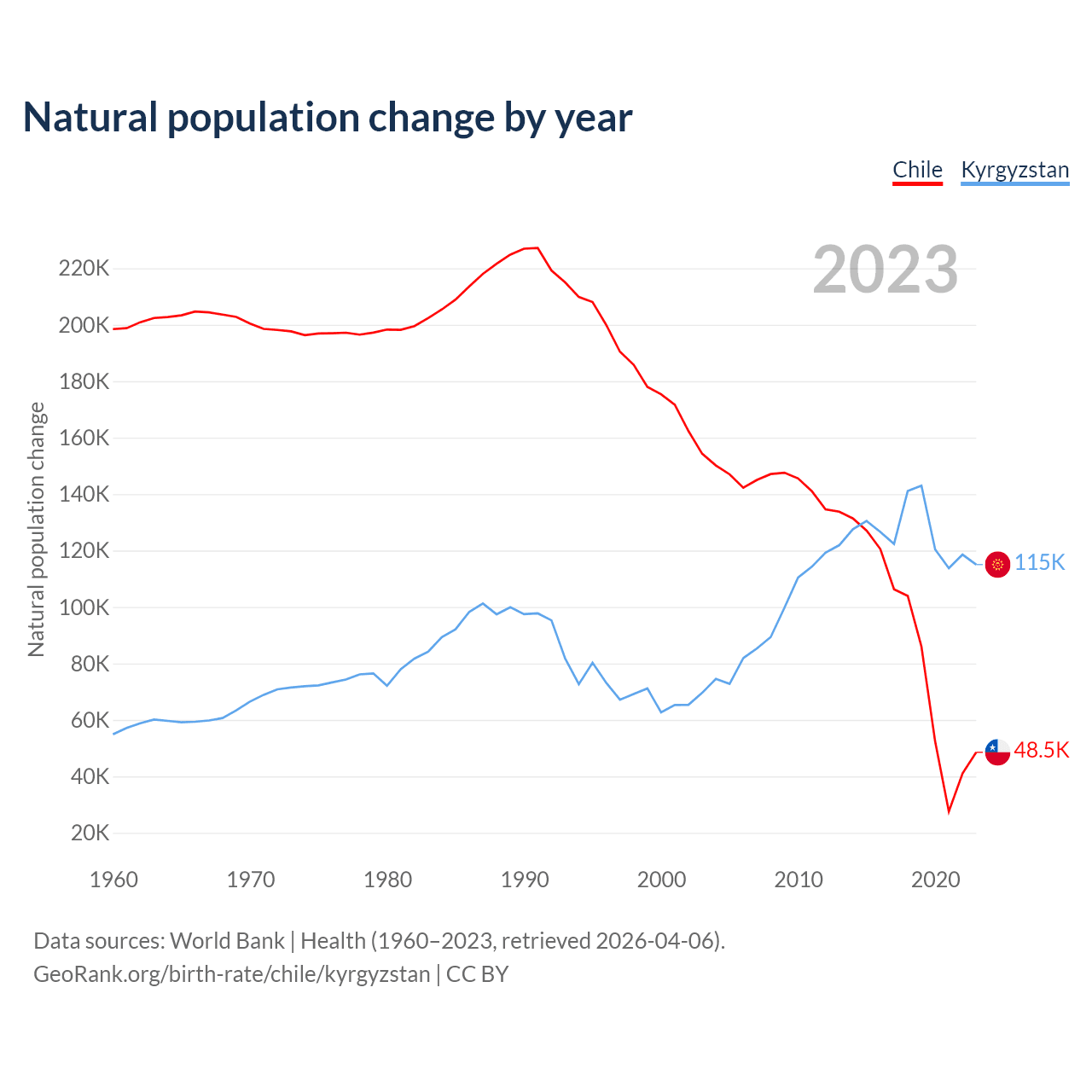 Chile has an annual birth rate of 8.96 births per 1,000 people, compared to 20.6 for Kyrgyzstan. The average number of children a woman is expected to have during her lifetime — the fertility rate, is 1.17 in Chile and 2.7 in Kyrgyzstan — 131.4% difference.