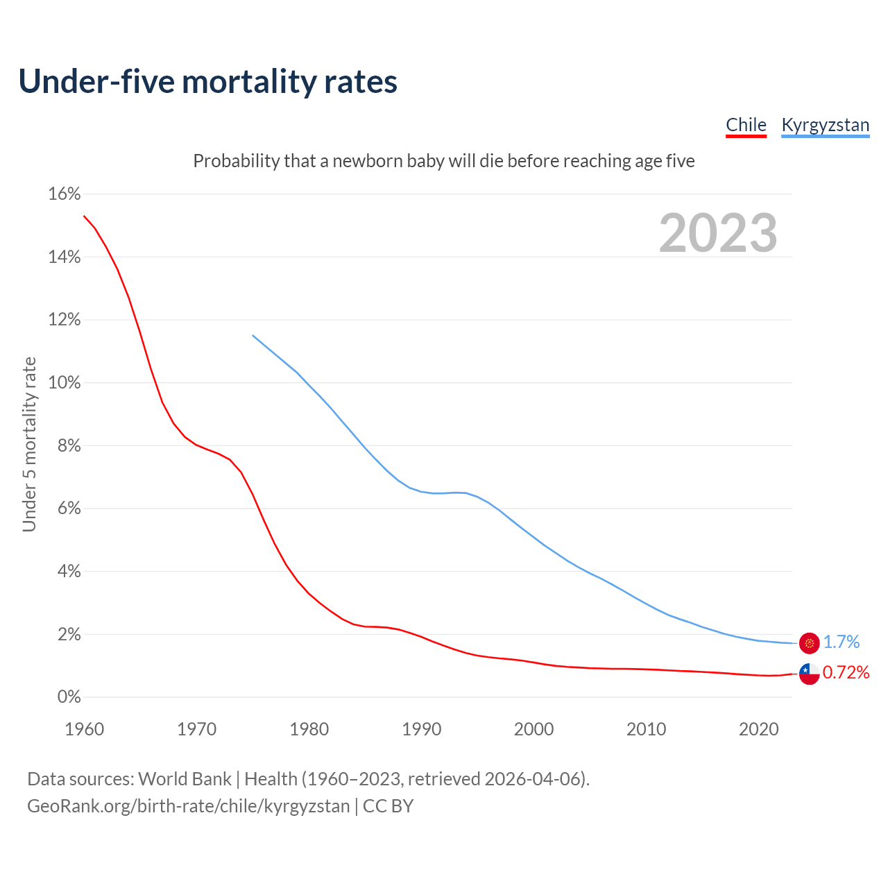 The chance that a newborn baby will die before reaching age five is 0.72% in Chile and 1.7% in Kyrgyzstan. Above is a chart with historical data on under-five mortality rates.