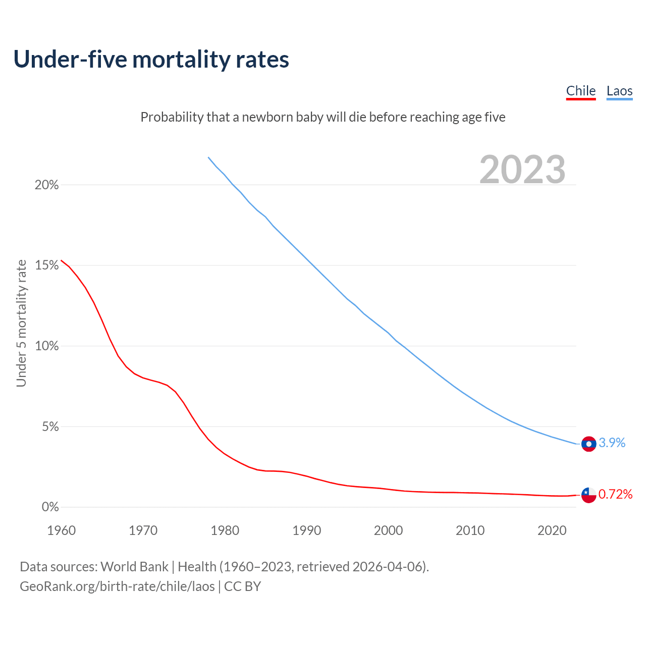 The chance that a newborn baby will die before reaching age five is 0.72% in Chile and 3.9% in Laos. Above is a chart with historical data on under-five mortality rates.