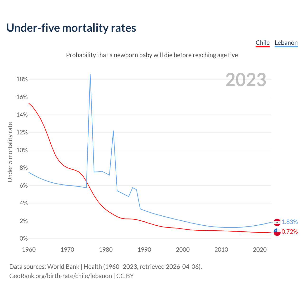 The chance that a newborn baby will die before reaching age five is 0.72% in Chile and 1.83% in Lebanon. Above is a chart with historical data on under-five mortality rates.