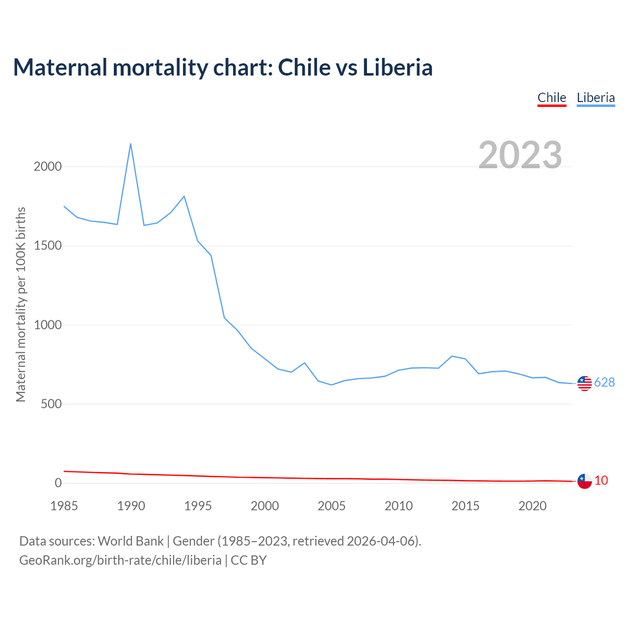 The maternal mortality rate, which is the probability of dying during childbirth or within 42 days of pregnancy termination, is 10 deaths per 100,000 live births in Chile, compared to 628 deaths in Liberia.
