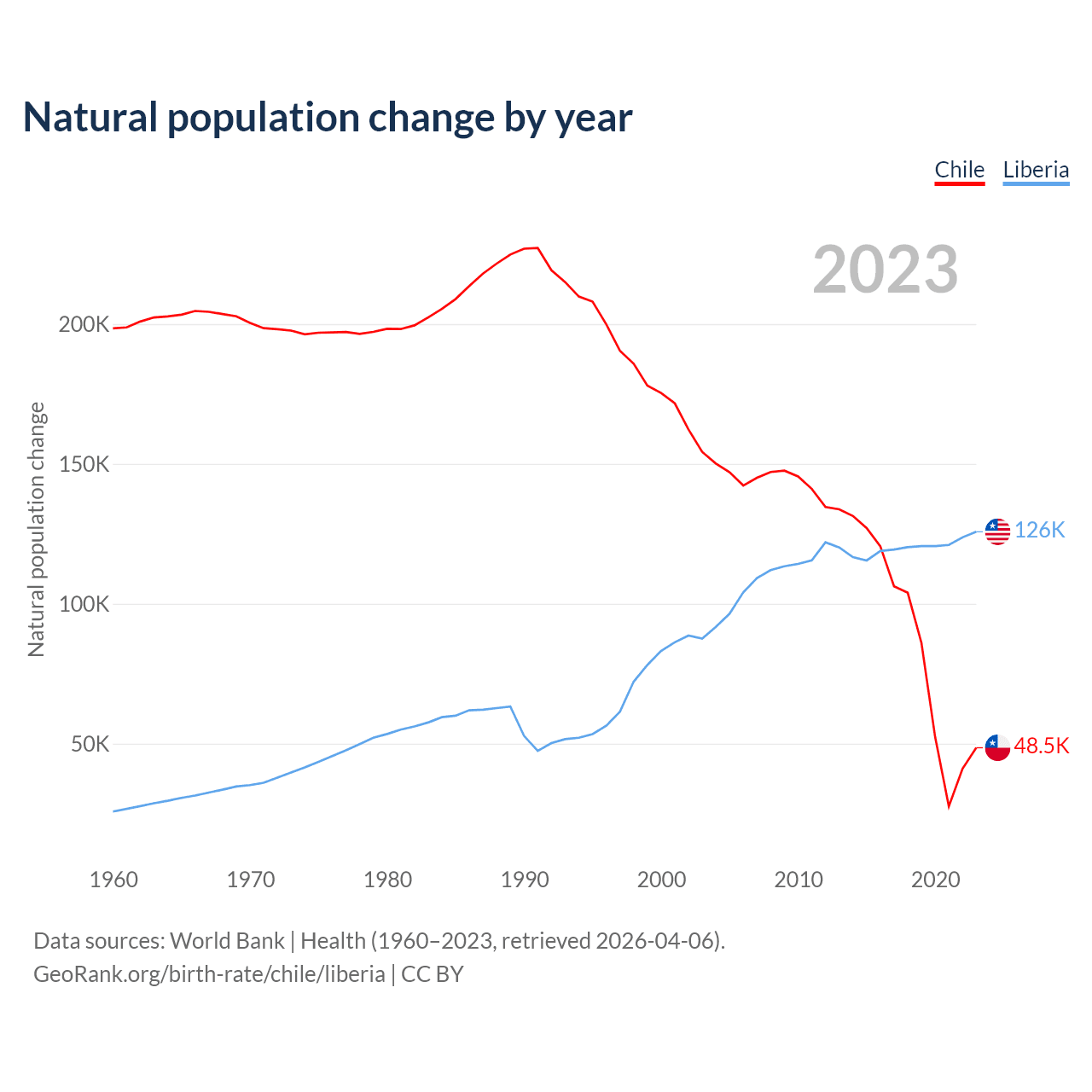 According to the latest available data on birth rates, the fertility rate in Chile was 1.17 children per woman in 2023, compared to 3.95 in Liberia in 2023. The replacement level is considered to be 2.1 children per woman.