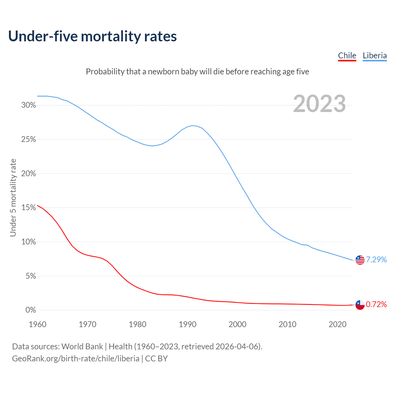 The chance that a newborn baby will die before reaching age five is 0.72% in Chile and 7.29% in Liberia. Above is a chart with historical data on under-five mortality rates.