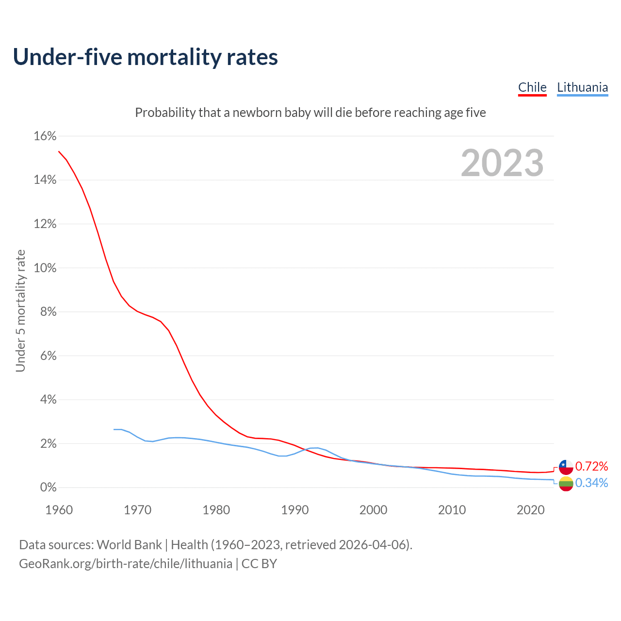 The chance that a newborn baby will die before reaching age five is 0.72% in Chile and 0.34% in Lithuania. Above is a chart with historical data on under-five mortality rates.