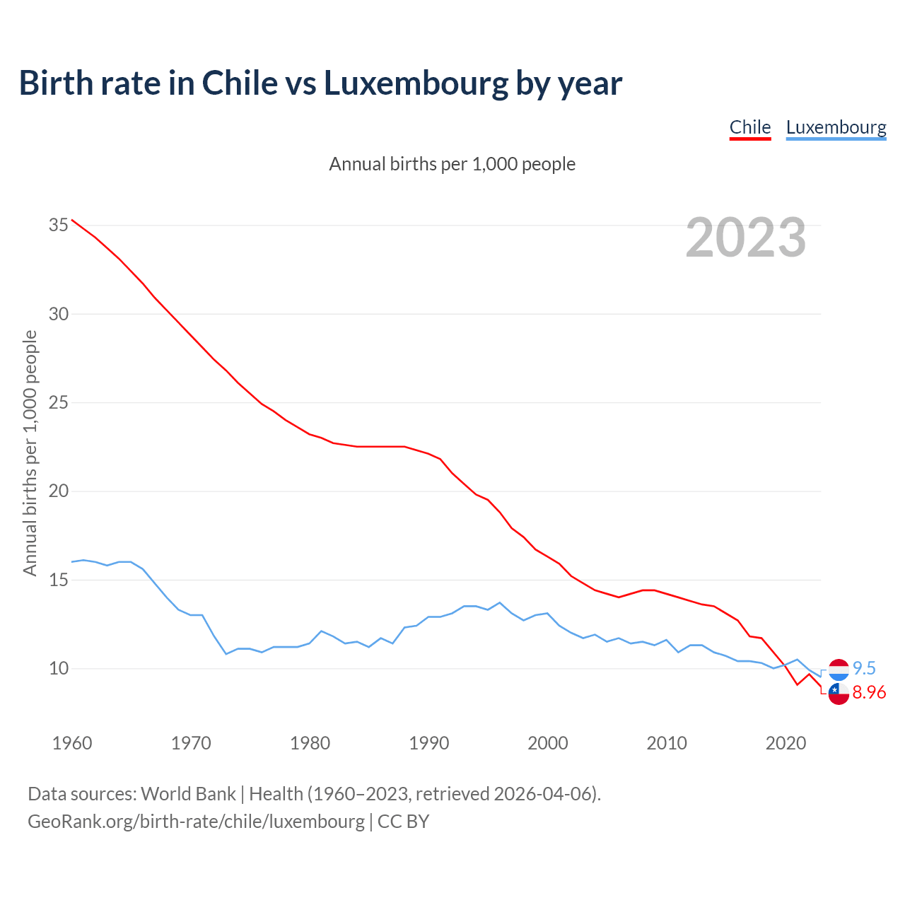 Chile has an annual birth rate of 8.96 births per 1,000 people, compared to 9.5 for Luxembourg. The average number of children a woman is expected to have during her lifetime — the fertility rate, is 1.17 in Chile and 1.25 in Luxembourg — 7.11% difference.