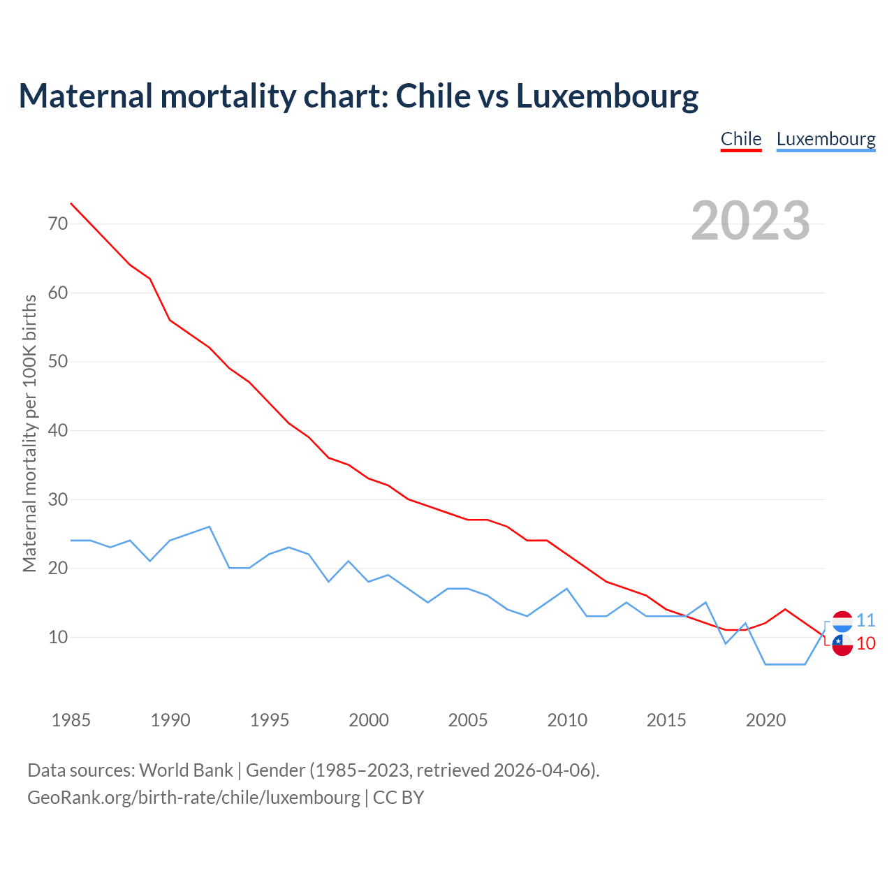 The maternal mortality rate, which is the probability of dying during childbirth or within 42 days of pregnancy termination, is 10 deaths per 100,000 live births in Chile, compared to 11 deaths in Luxembourg.