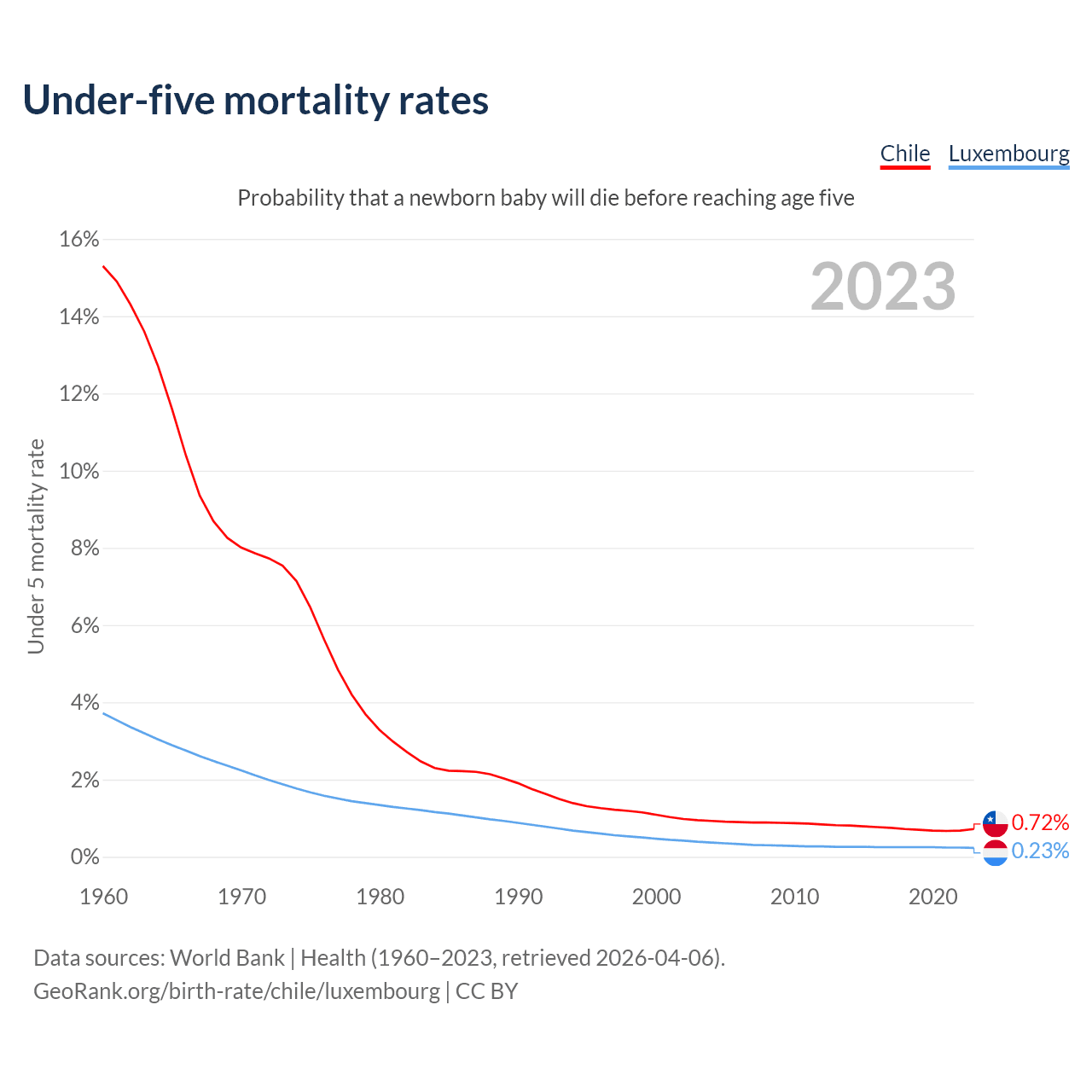 The chance that a newborn baby will die before reaching age five is 0.72% in Chile and 0.23% in Luxembourg. Above is a chart with historical data on under-five mortality rates.