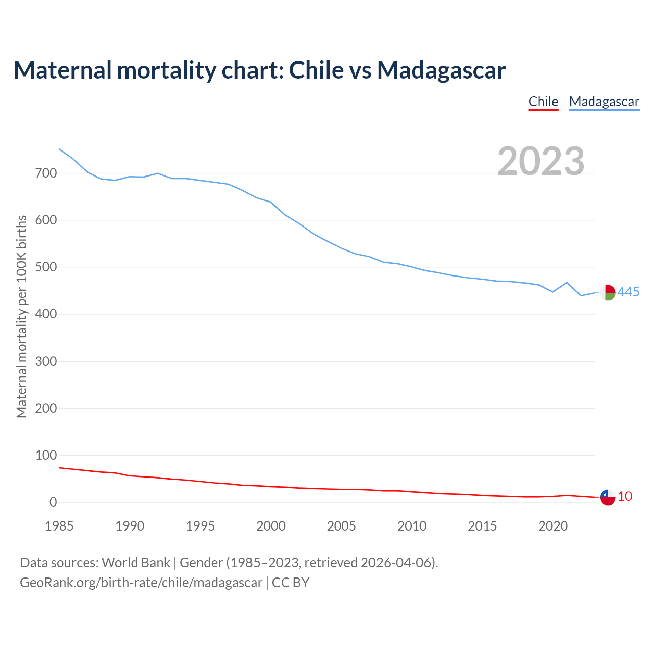 The maternal mortality rate, which is the probability of dying during childbirth or within 42 days of pregnancy termination, is 10 deaths per 100,000 live births in Chile, compared to 445 deaths in Madagascar.