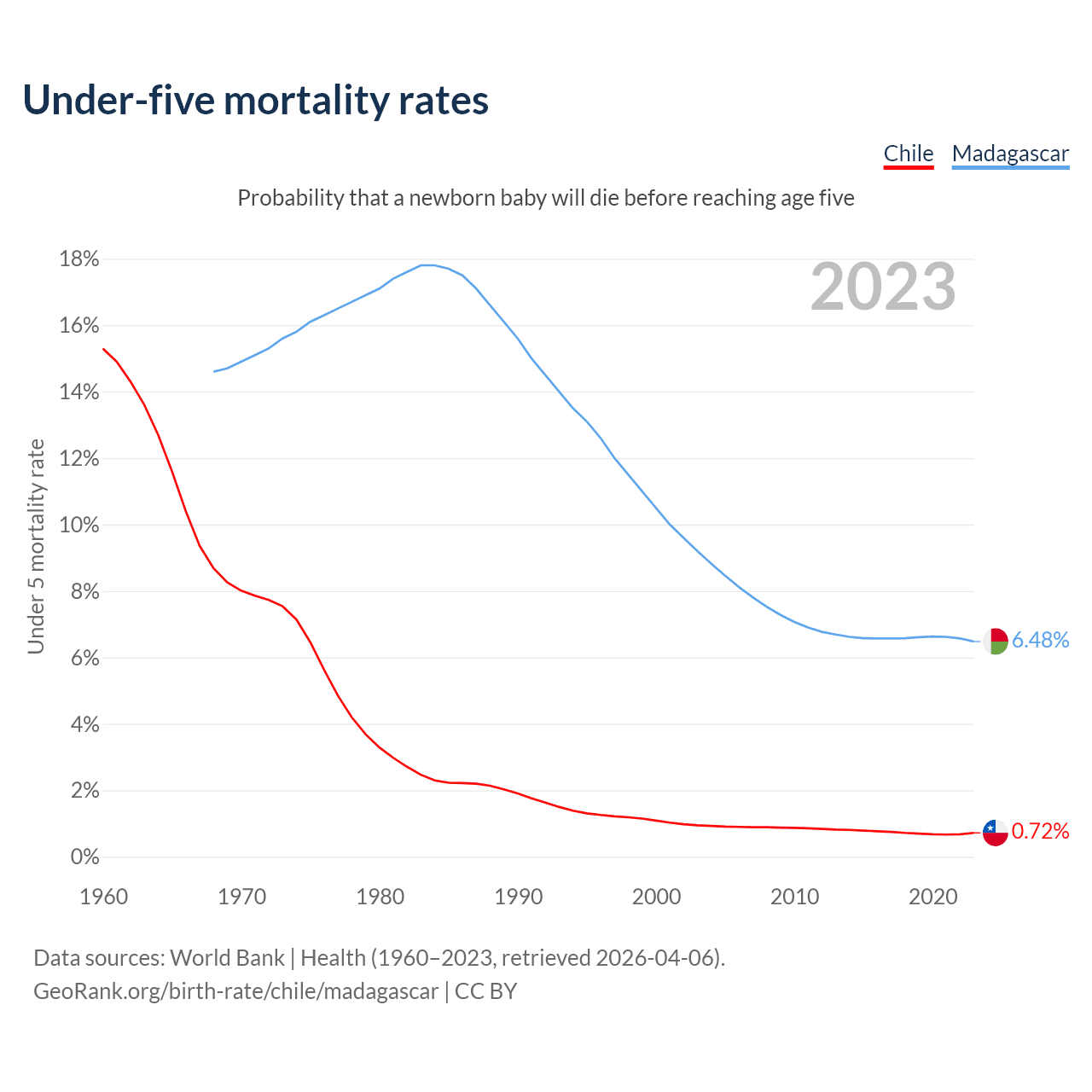 The chance that a newborn baby will die before reaching age five is 0.72% in Chile and 6.48% in Madagascar. Above is a chart with historical data on under-five mortality rates.