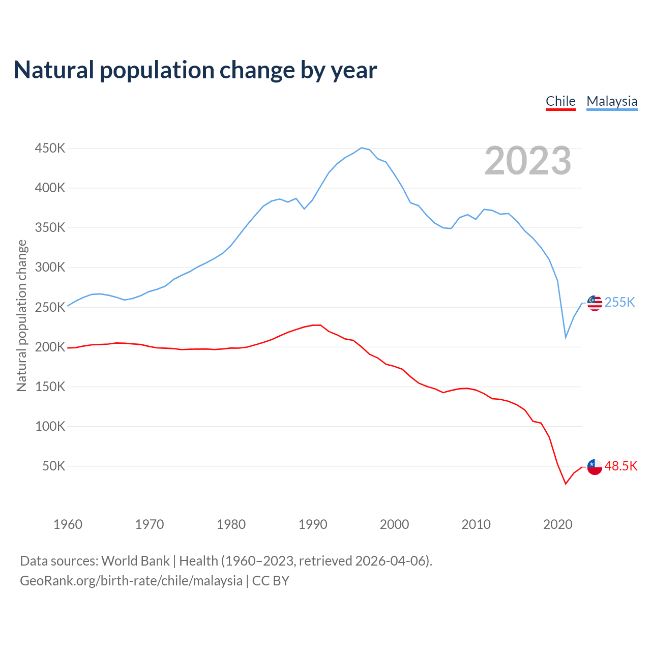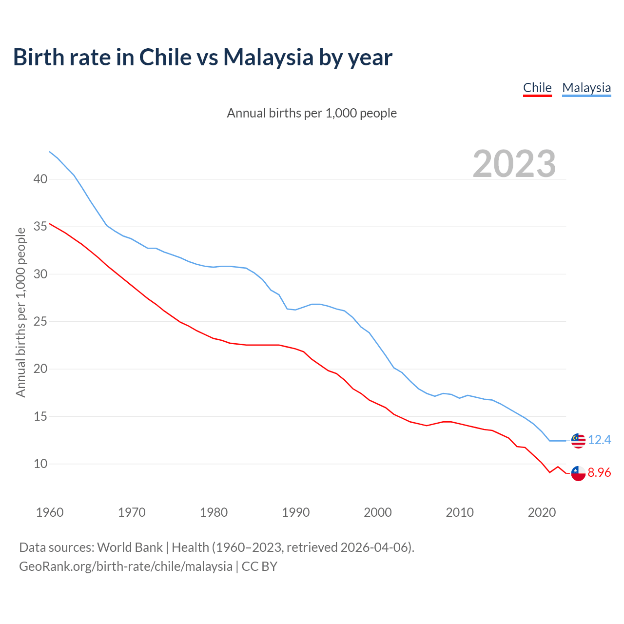 According to the latest available data on birth rates, the fertility rate in Chile was 1.17 children per woman in 2023, compared to 1.55 in Malaysia in 2023. The replacement level is considered to be 2.1 children per woman.