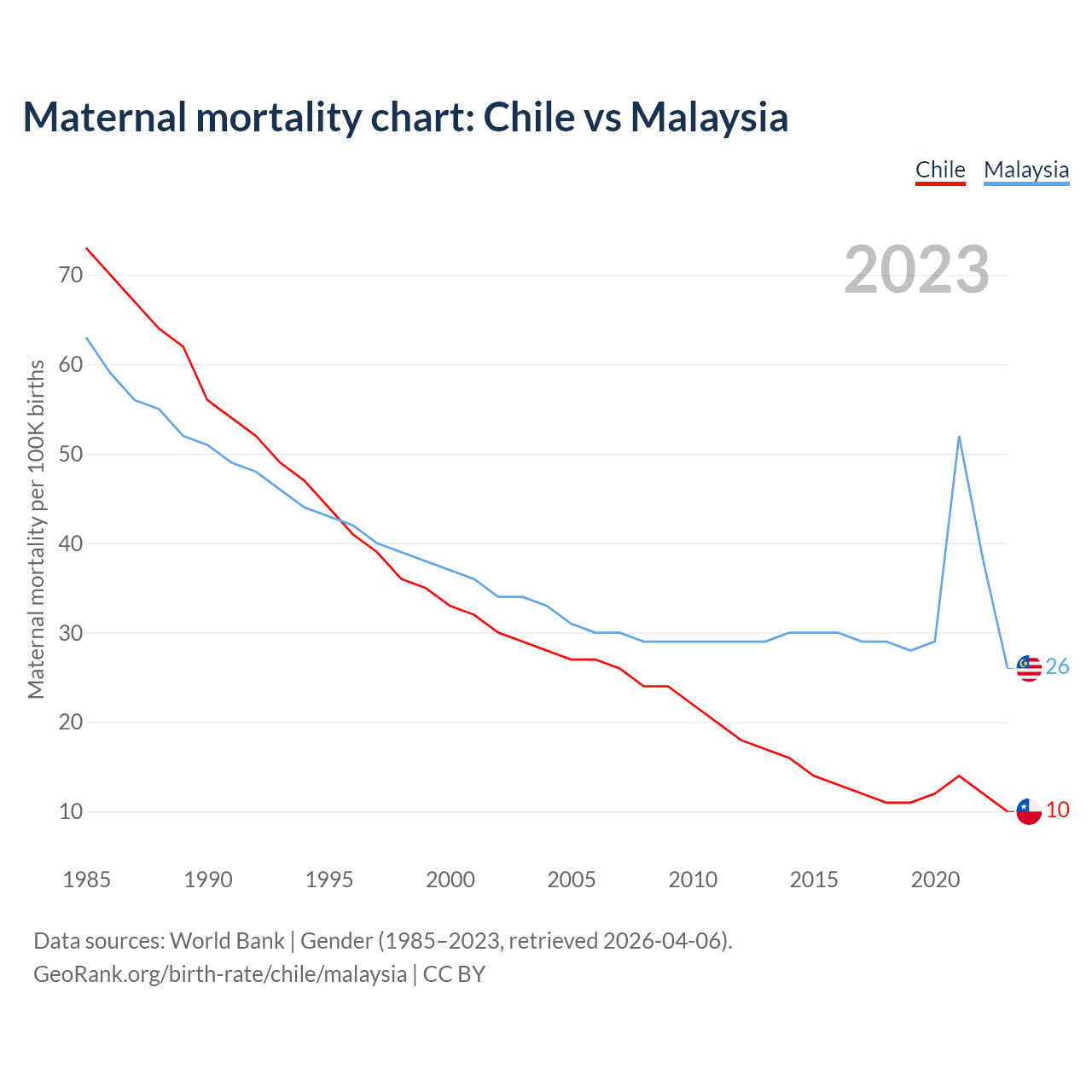 The maternal mortality rate, which is the probability of dying during childbirth or within 42 days of pregnancy termination, is 10 deaths per 100,000 live births in Chile, compared to 26 deaths in Malaysia.