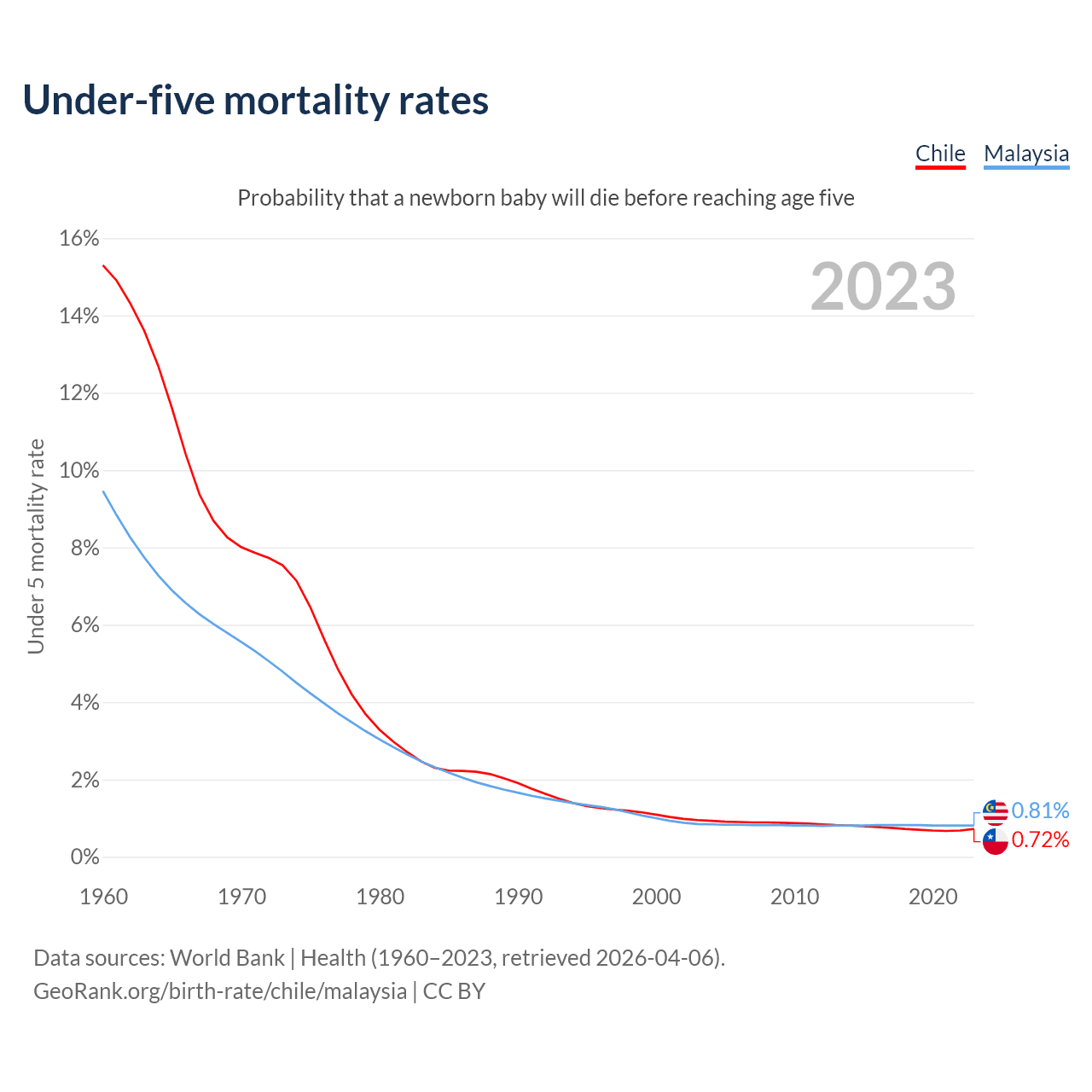 The chance that a newborn baby will die before reaching age five is 0.72% in Chile and 0.81% in Malaysia. Above is a chart with historical data on under-five mortality rates.
