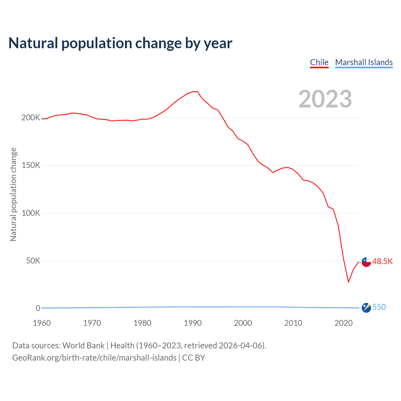 Chile has an annual birth rate of 8.96 births per 1,000 people, compared to 21.1 for the Marshall Islands. The average number of children a woman is expected to have during her lifetime — the fertility rate, is 1.17 in Chile and 2.92 in the Marshall Islands — 150.1% difference.