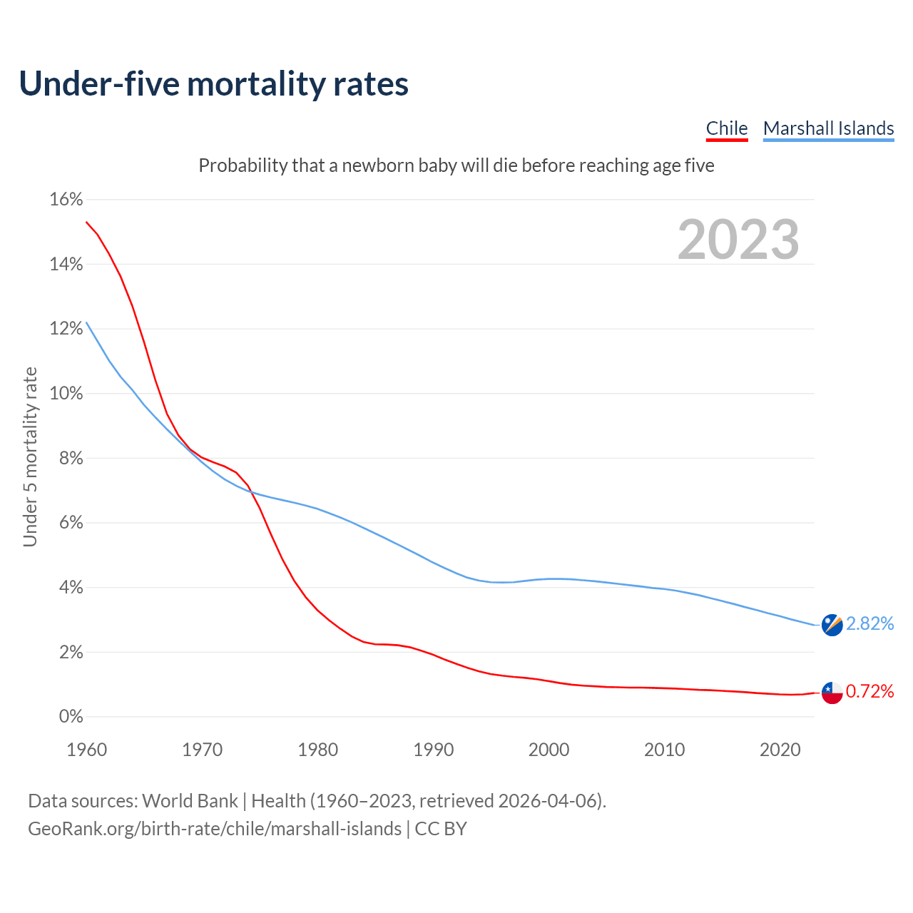 The chance that a newborn baby will die before reaching age five is 0.72% in Chile and 2.82% in the Marshall Islands. Above is a chart with historical data on under-five mortality rates.