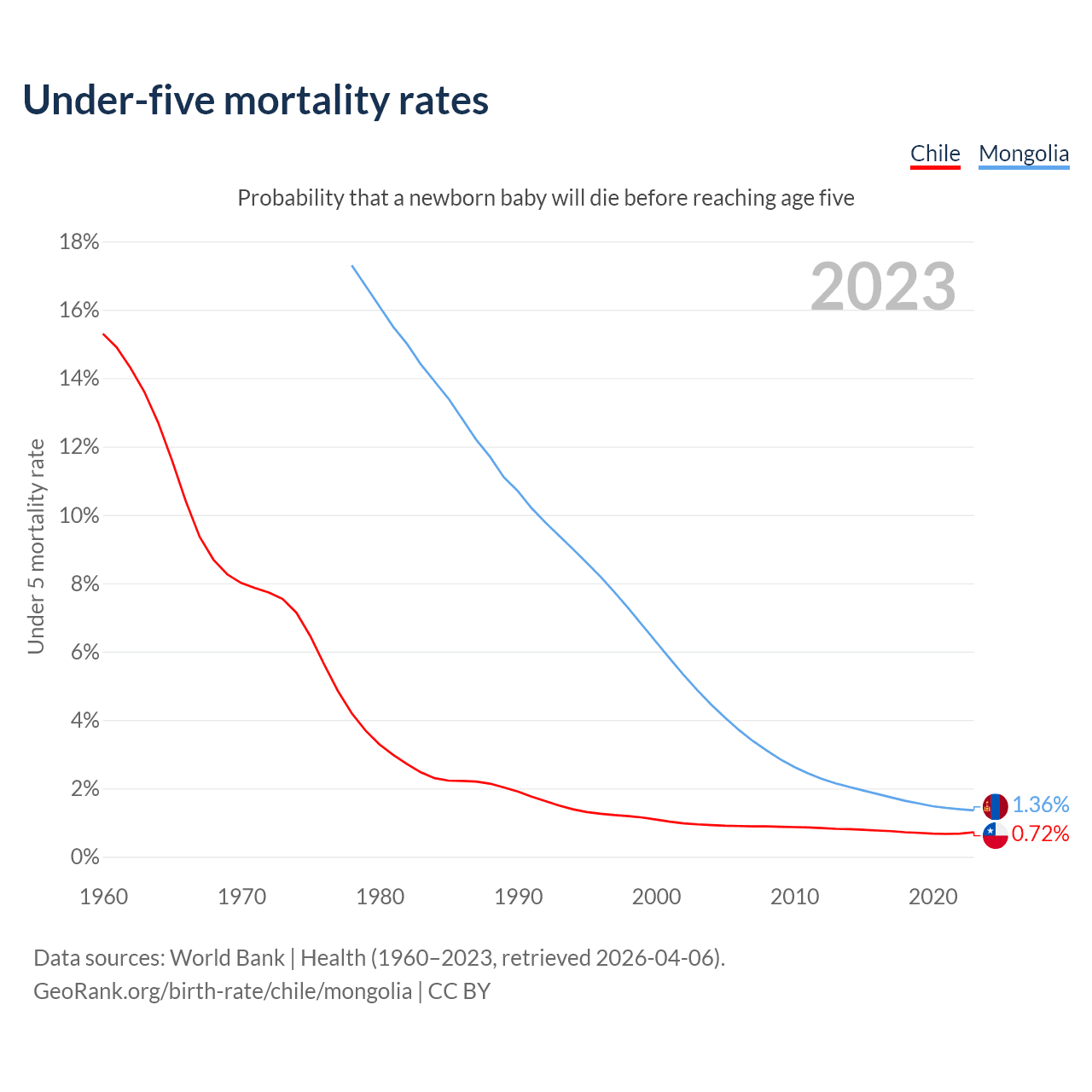 The chance that a newborn baby will die before reaching age five is 0.72% in Chile and 1.36% in Mongolia. Above is a chart with historical data on under-five mortality rates.
