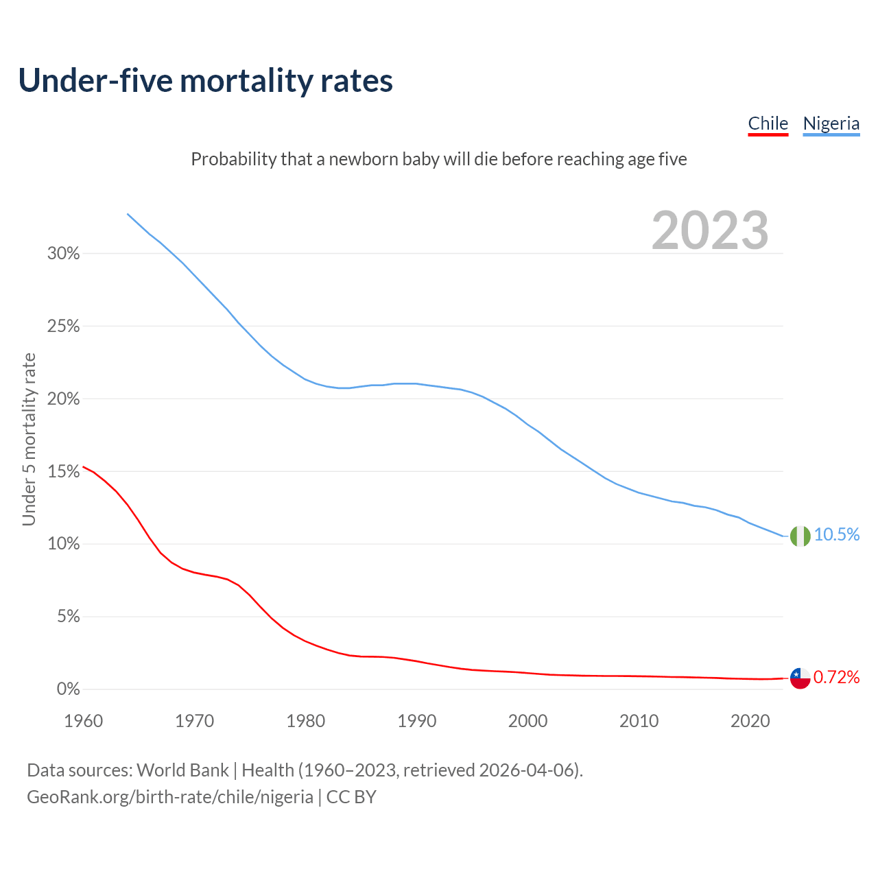 The chance that a newborn baby will die before reaching age five is 0.72% in Chile and 10.5% in Nigeria. Above is a chart with historical data on under-five mortality rates.
