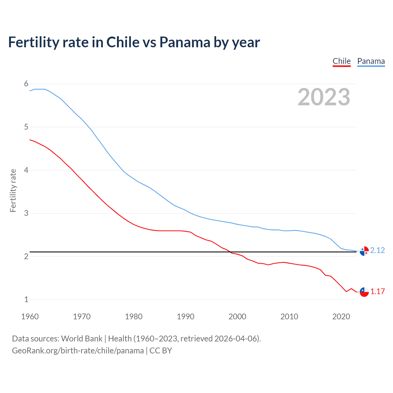 1960 vs 2023, the fertility rate has decreased by 75.2% in Chile and by 63.6% in Panama — in 1960, it was 4.7 and 5.83, respectively.