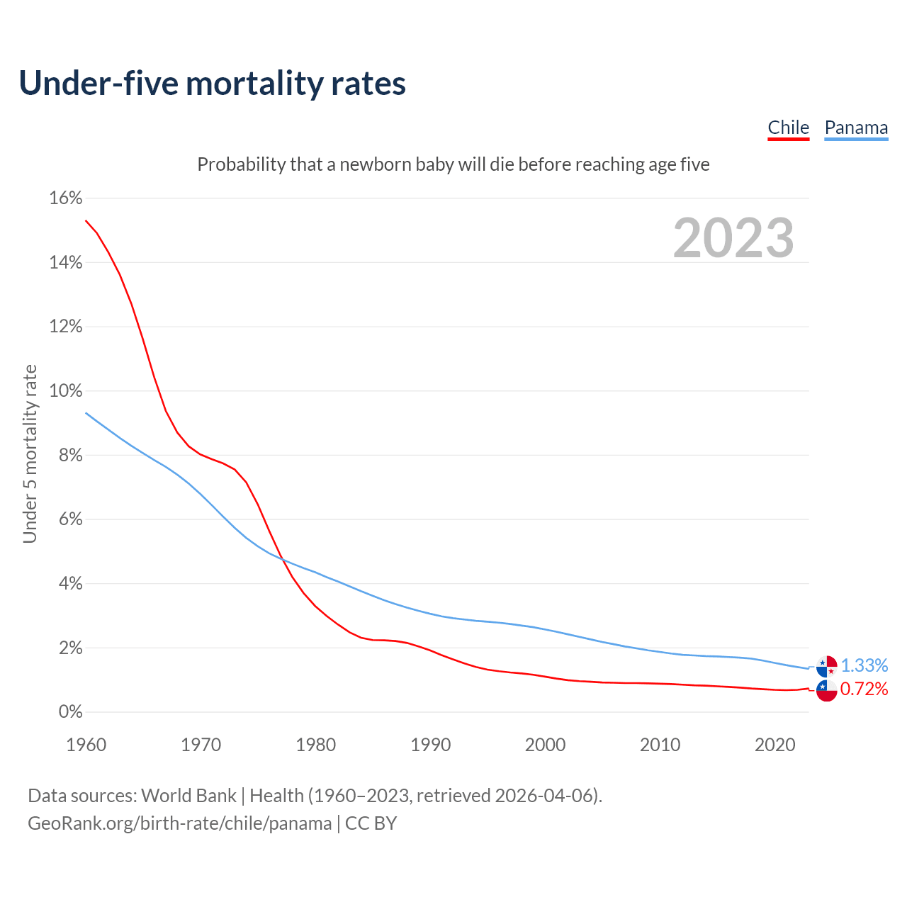 The chance that a newborn baby will die before reaching age five is 0.72% in Chile and 1.33% in Panama. Above is a chart with historical data on under-five mortality rates.