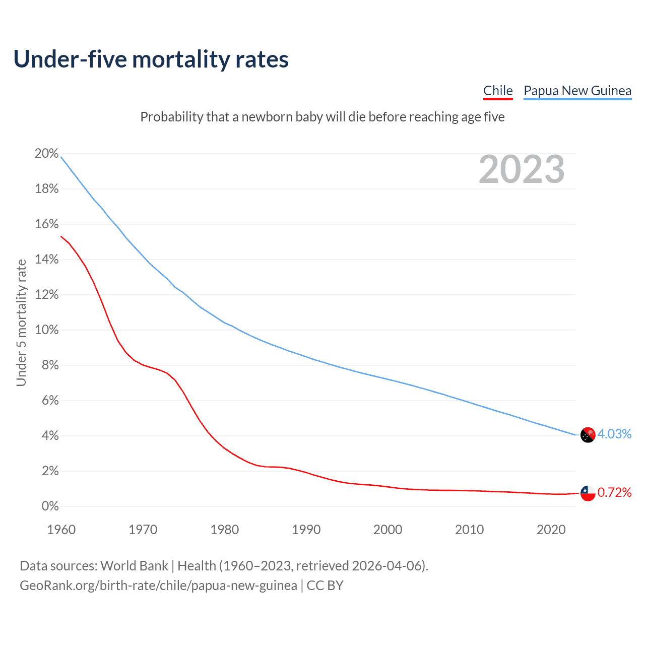 The chance that a newborn baby will die before reaching age five is 0.72% in Chile and 4.03% in Papua New Guinea. Above is a chart with historical data on under-five mortality rates.