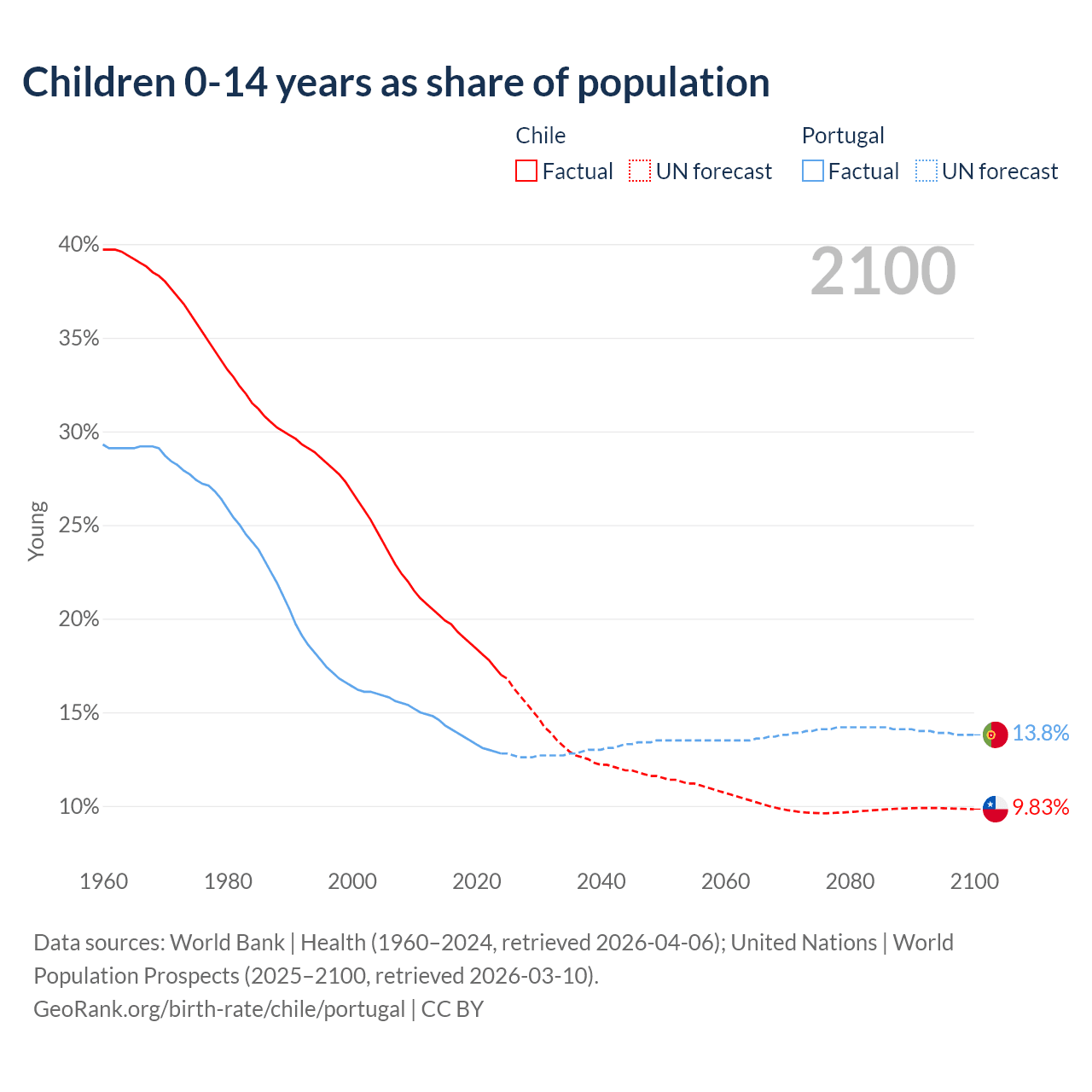 Chile has an annual birth rate of 8.96 births per 1,000 people, compared to 8.1 for Portugal. The average number of children a woman is expected to have during her lifetime — the fertility rate, is 1.17 in Chile and 1.44 in Portugal — 23.4% difference.