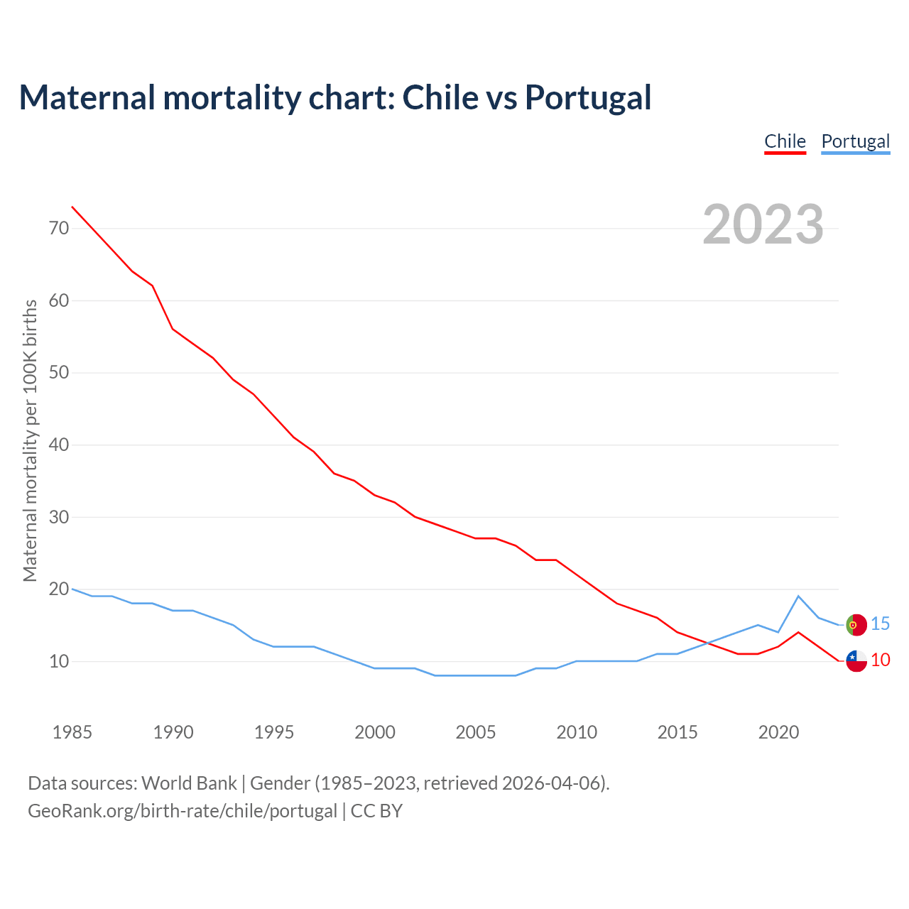 The maternal mortality rate, which is the probability of dying during childbirth or within 42 days of pregnancy termination, is 10 deaths per 100,000 live births in Chile, compared to 15 deaths in Portugal.
