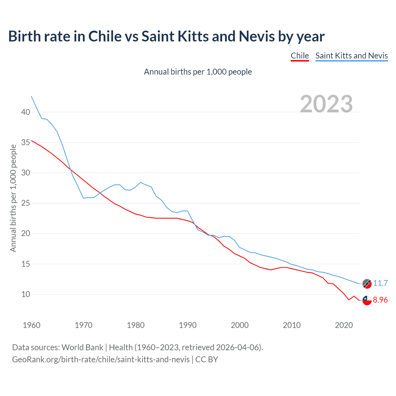 Chile has an annual birth rate of 8.96 births per 1,000 people, compared to 11.7 for Saint Kitts and Nevis. The average number of children a woman is expected to have during her lifetime — the fertility rate, is 1.17 in Chile and 1.51 in Saint Kitts and Nevis — 29% difference.