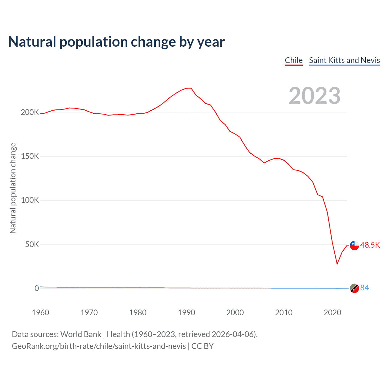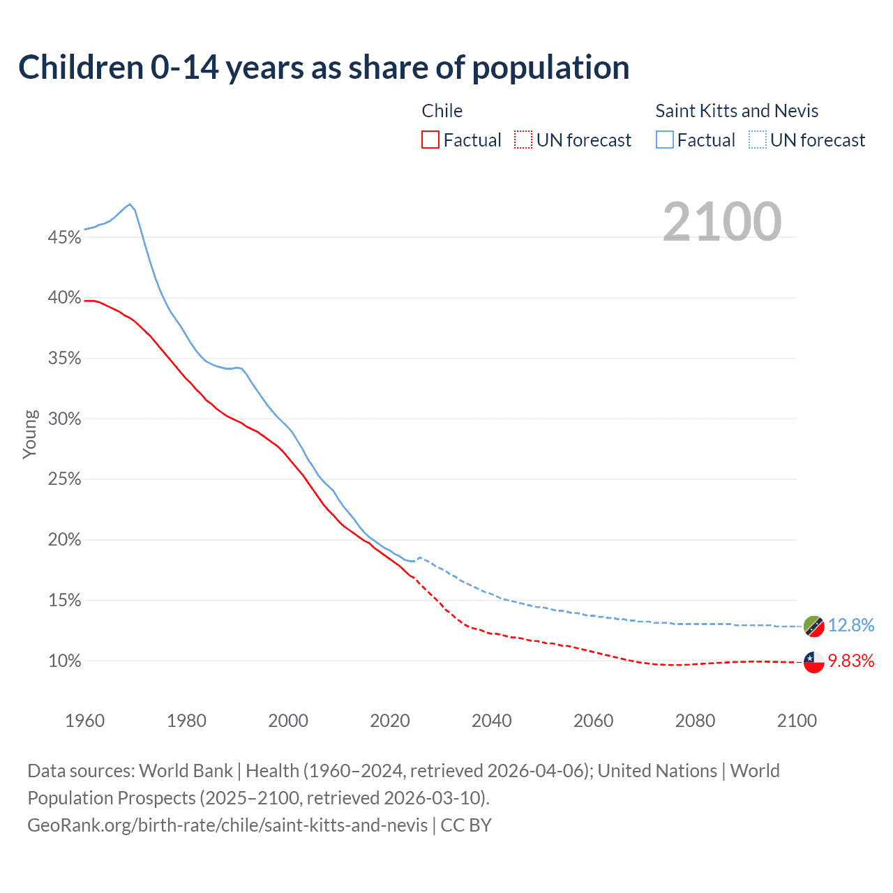 According to the latest available data on birth rates, the fertility rate in Chile was 1.17 children per woman in 2023, compared to 1.51 in Saint Kitts and Nevis in 2023. The replacement level is considered to be 2.1 children per woman.