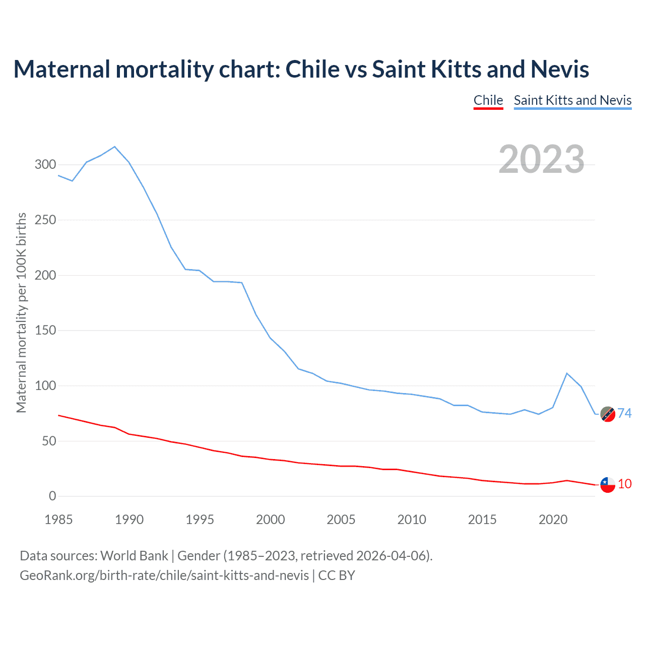 The maternal mortality rate, which is the probability of dying during childbirth or within 42 days of pregnancy termination, is 10 deaths per 100,000 live births in Chile, compared to 74 deaths in Saint Kitts and Nevis.