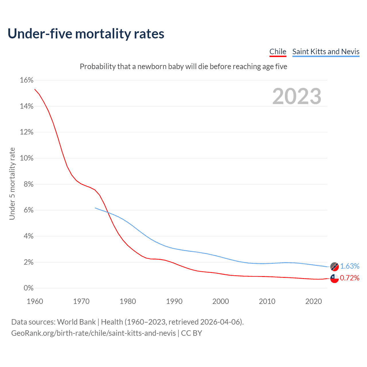 The chance that a newborn baby will die before reaching age five is 0.72% in Chile and 1.63% in Saint Kitts and Nevis. Above is a chart with historical data on under-five mortality rates.