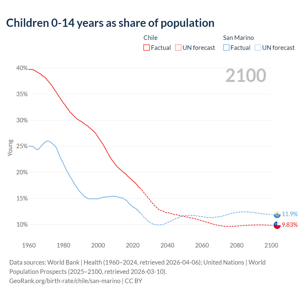 According to the latest available data on birth rates, the fertility rate in Chile was 1.17 children per woman in 2023, compared to 1.15 in San Marino in 2023. The replacement level is considered to be 2.1 children per woman.