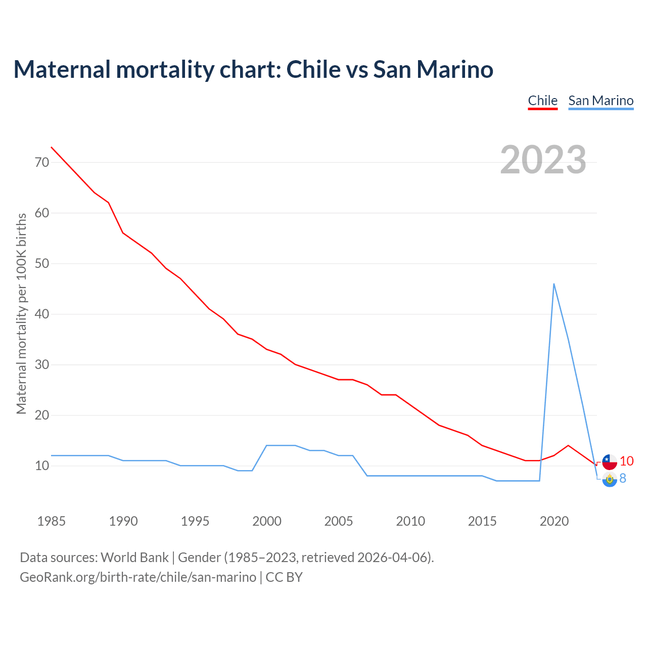 The maternal mortality rate, which is the probability of dying during childbirth or within 42 days of pregnancy termination, is 10 deaths per 100,000 live births in Chile, compared to 8 deaths in San Marino.