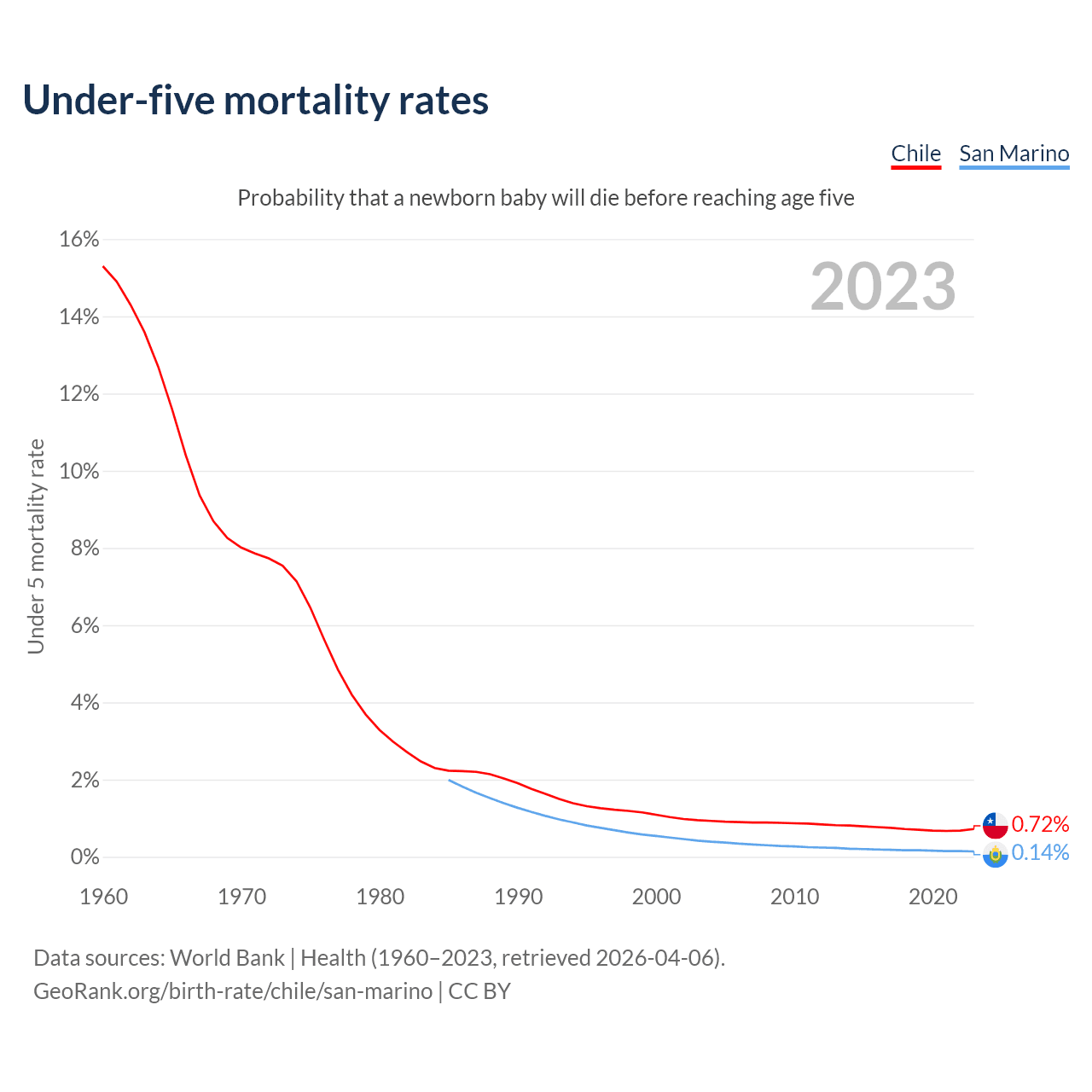 The chance that a newborn baby will die before reaching age five is 0.72% in Chile and 0.14% in San Marino. Above is a chart with historical data on under-five mortality rates.