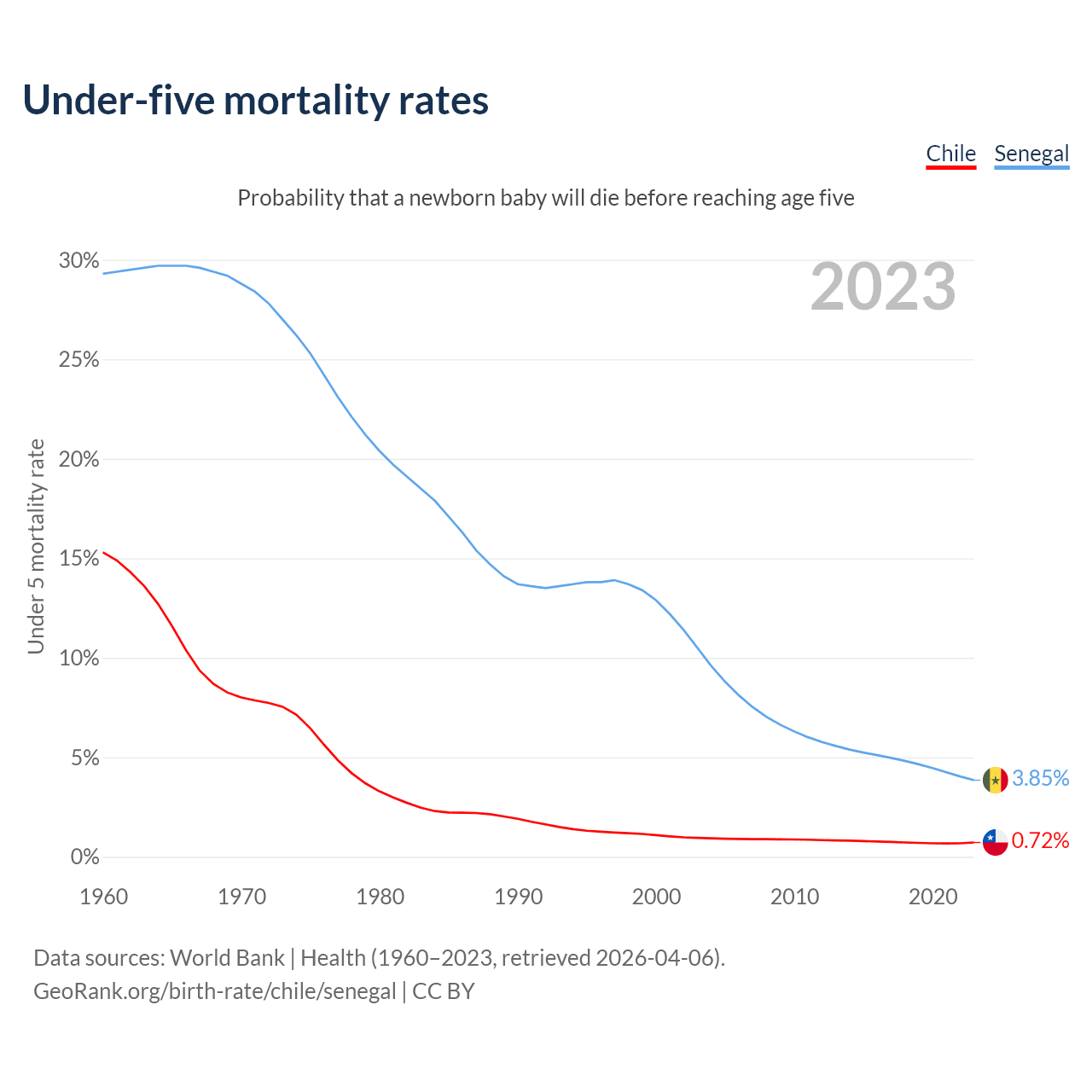 The chance that a newborn baby will die before reaching age five is 0.72% in Chile and 3.85% in Senegal. Above is a chart with historical data on under-five mortality rates.