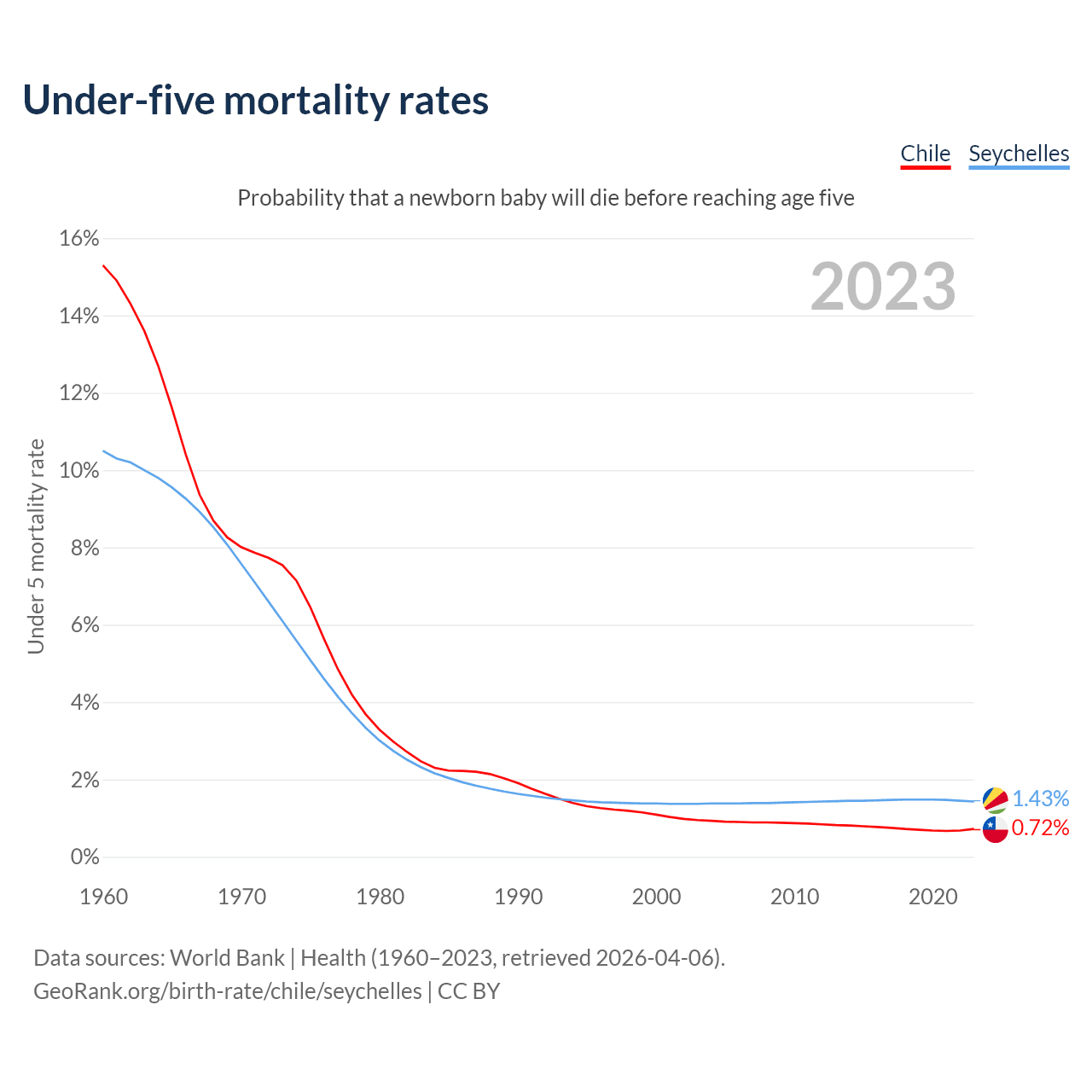 The chance that a newborn baby will die before reaching age five is 0.72% in Chile and 1.43% in the Seychelles. Above is a chart with historical data on under-five mortality rates.
